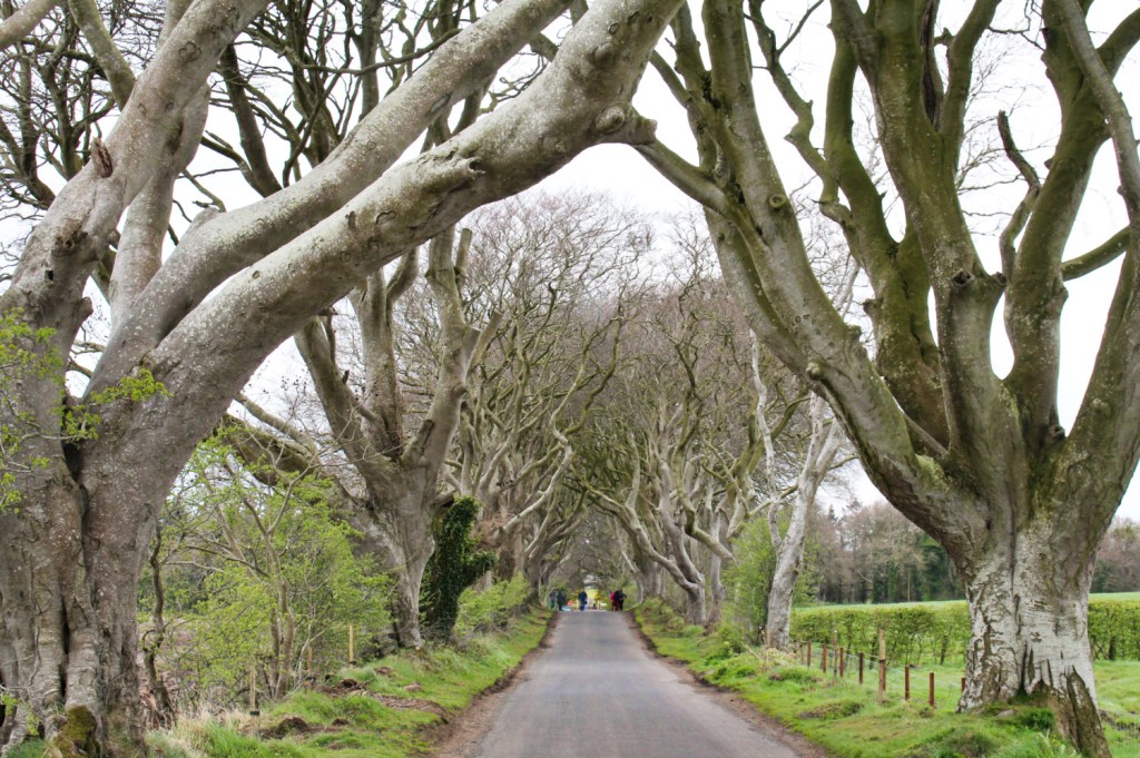 Notre premier arrêt fut pour les Dark Hedges (« les haies sombres »). Cet endroit est devenu le lieu de tournage le plus populaire. Il s’agit d’une simple petite route de campagne perdue au milieu d’absolument nulle part (près de Stranocum), même le GPS ne connaissait pas. Il n’y a aucun panneau pour vous indiquer où est cette désormais fameuse route donc vous risquez de tourner un peu dans les environs avant de la trouver. Encore totalement inconnue il y a 3 ans, cette route bordée de vieux hêtres est maintenant très touristique. Pour tout dire c’était même un peu le bazar lors de ma visite, alors qu’il faisait à peine 5°C dehors et qu’il pleuvait (bref, un vrai temps de Westeros!). La route n’est pas aménagée pour les touristes et les locaux l’empruntent donc aussi. Sans compter les touristes un peu idiots qui au lieu de se garer à un bout ou l’autre de la route viennent s’arrêter en plein milieu avec leur voiture…sympa pour les photos. Evidemment le lieu n’est pas aussi magique que dans la série mais ça vaut quand même le déplacement, ces arbres sont superbes.