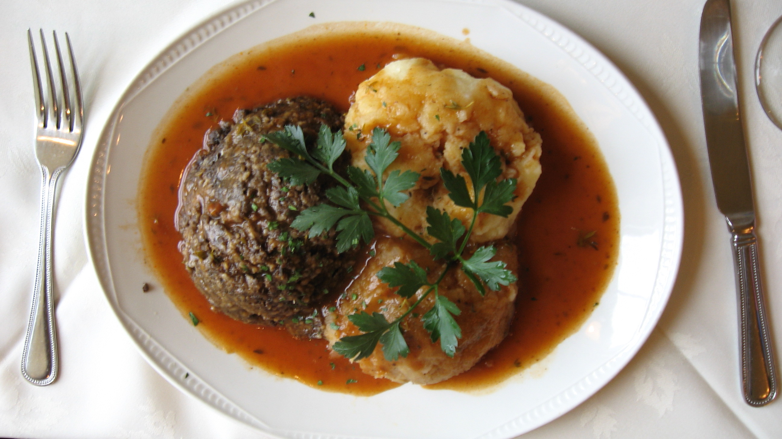 J’aime tellement l’Ecosse que j’aime le haggis! Pour les novices, il est peut-être nécessaire de définir ce qu’est le haggis: il s’agit de panse de brebis farcie. Pour donner un peu plus de détails, le haggis est composé d’abats de mouton (poumon, cœur et foie), d’oignons, d’avoine et d’épices comme de la muscade. Le tout est traditionnellement cuit dans une panse de brebis. Ca n’a pas l’air très ragoutant dit ainsi, et j’avoue mon scepticisme avant d’y goûter. Le haggis est présenté sorti de la panse (ouf!), sous une forme de boule de viande finement hachée avec une purée de pommes de terre (tatties) et une purée de navets (neeps). Si on ne pense pas trop à ce que l’on est en train d’avaler, je dois dire que c’est très bon, et assez épicé. N’oubliez pas d’arroser votre repas avec un verre de whisky!
