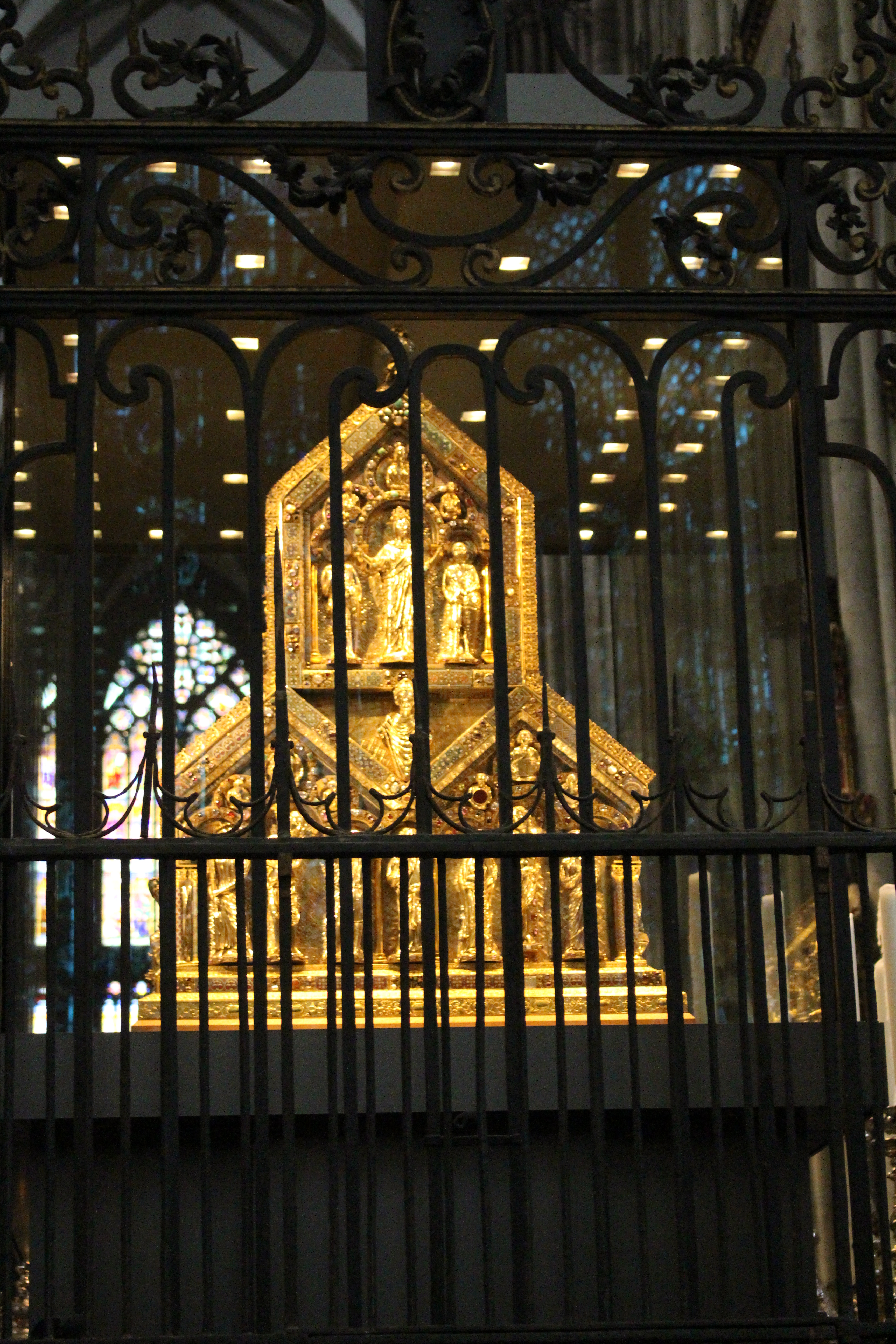Les reliques des Rois Mages sont enfermées dans une châsse dorée dans le chœur de la cathédrale. Cette partie de la cathédrale n’est ouverte que quelques heures par jour (heureusement que je suis restée deux jours à Cologne, car le premier jour les grilles étaient fermées et ma frustration était totale). La châsse en or est protégée par un caisson de verre et des grilles de fer, on ne peut donc pas s’en approcher réellement (frustration partielle quand même).
