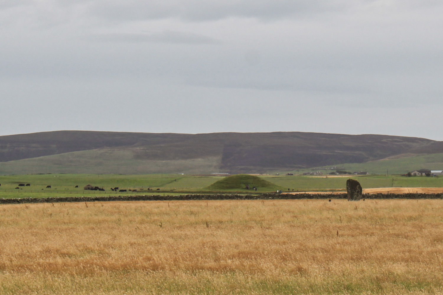 C’est ici que vibre le cœur des fouilles dans les Orcades. Situé sur la mince langue de terre entre le loch de Stenness (eau de mer) et le loch de Harray (eau douce), ce n’est qu’en 2003 qu’est découvert ce site dans le jardin d’une maison. Le site n’est fouillé que huit semaines par an en été mais des bénévoles y viennent du monde entier. Le reste de l’année le site est recouvert de bâches et pneus, et nous avons malheureusement manqué ça à quelques jours près (mais nous avons bu les paroles des bénévoles et professeurs que nous avons rencontrés pendant notre séjour et qui nous ont raconté les fouilles avec passion). Il s’agit d’un grand complexe néolithique de 5000 ans environ qui comporte douze grands bâtiments entourés par une enceinte épaisse. D’importantes découvertes ont lieu tous les ans et les experts pensent désormais qu’il s’agit du plus grand site rituel du Néolithique en Europe. Le site n’est pas destiné à être ouvert au public dans le futur (lors de la période de fouilles, on peut l’observer sur un échafaudage) car les fouilles seront limitées dans le temps. Elles étaient largement financées par l’Union européenne et le Brexit va compliquer les années à venir. Dans quelques années, le site sera de nouveau enfoui, recouvert de terre pour le cacher et ainsi le préserver.