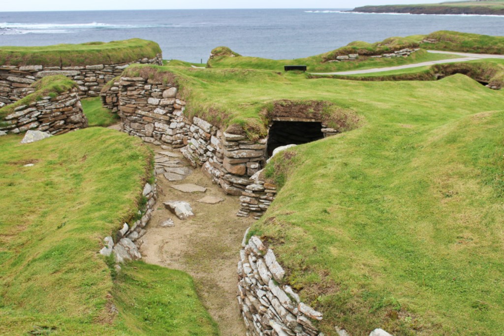 C’est le site le plus réputé des Orcades et celui qui draine le plus de touristes (souvent des touristes débarqués pour la journée des bateaux de croisière). C’est tout simplement le village néolithique le mieux préservé d’Europe et il est tout à fait étonnant. Ses habitants auraient vécu ici il y a 5000 ans, la mer était alors plus éloignée des abords du site. Les habitants n’étaient donc pas des pêcheurs mais des fermiers (même s’ils pêchaient et chassaient aussi). Le village est demeuré enfoui sous les dunes pendant des milliers d’années et c’est une tempête en 1850 qui dévoila l’existence du village en érodant le haut des dunes. Il est composé de huit bâtiments semi-enterrés avec des toits de terre (sept maisons et un atelier) reliés par des petites ruelles couvertes. Les habitants vivaient donc dans une communauté de 50 à 100 personnes. Ce qui frappe c’est de se rendre compte qu’il y a 5000 ans, les hommes et femmes du Néolithique avaient déjà posé les bases de nos habitations actuelles avec du mobilier (des lits, couvertures, cuisine, espaces de rangement, étagères, même de petites toilettes séparées) et un foyer au centre.
