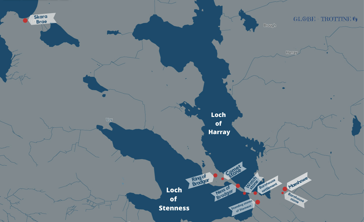 • tous les sites cités sont accessibles en voiture ou en bus avec la ligne X1 et 8S (pour Skara Brae)