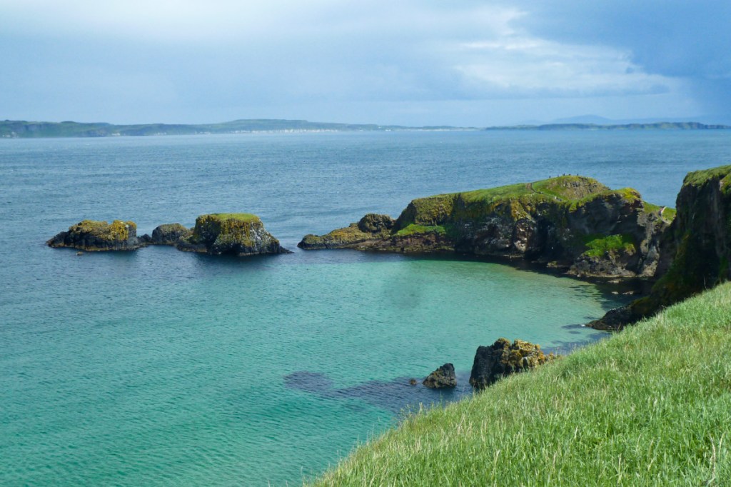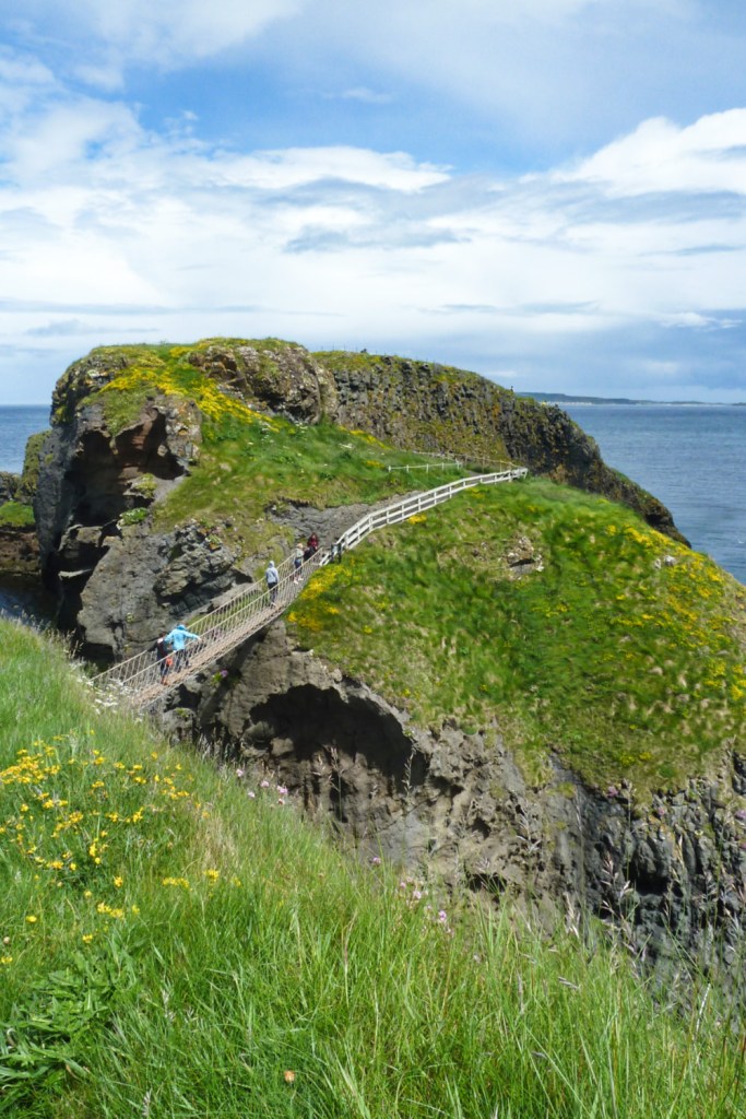 Après quelques minutes à marcher le long de la côte, vous arriverez à un petit pont suspendu de 30 m de haut au-dessus de l’eau qui relie les deux rochers du bout. Cela fait 350 ans qu’il y a un pont de cordes à cet endroit, il servait aux pêcheurs de saumons pour aller récupérer leurs filets. Néanmoins les pêcheurs ne s’en servent plus en ce moment pour préserver les ressources. Le pont a été sécurisé en 2008 et ouvert aux touristes. Long de 20 m (et ne pouvant supporter que 8 personnes à la fois), le Carrick-a-Rede Rope Bridge peut faire peur (il est souvent cité parmi les ponts les plus impressionnants du monde). En toute relativité, il n’est pas non plus infranchissable mais comme il n’est constitué que de planches et de cordes, il bouge facilement. Cependant, la traversée vaut vraiment le coup. Une fois de l’autre côté, vous pourrez observer au loin les côtes écossaises. Vous pourrez observer également les oiseaux et les fleurs des rochers, et si vous vous retournez vers la terre ferme, vous pourrez voir des grottes qu’on aimerait bien partir explorer (et qu’on ne voit que si on a traversé). Par beau temps, la mer a des nuances prodigieuses de bleu et de vert allant du bleu encre à certains endroits pour virer carrément au turquoise presque transparent à d’autres endroits. Moi, j’avais l’impression de marcher dans une carte postale dans ce site.