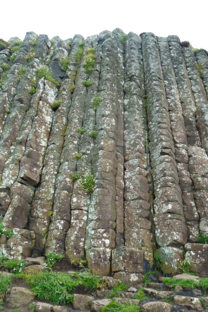Alors pourquoi est-ce que ce site s’appelle la Chaussée des Géants (Giants’ Causeway)? La légende locale raconte qu’un géant appelé Finn MacCool avait construit un chemin en jetant des pierres pour traverser la mer jusqu’en Ecosse. Il voulait affronter son ennemi juré, un autre géant du nom de Benandonner. Mais lorsqu’il le vit arriver sur le chemin, il prit peur et partit se cacher chez lui. Sa femme Oonagh le déguisa avec des vêtements pour bébé et lorsque Benandonner arriva dans la demeure, il fut effrayé par la taille du bébé et se dit que son père devait donc avoir une taille gigantesque. Il repartit en Ecosse les jambes à son cou en prenant soin de détruire le chemin derrière lui afin que Finn MacCool ne traverse jamais la mer. Pour qui veut croire à la légende, sachez qu’il existe en Ecosse (sur le site de Staffa) un endroit avec des pierres similaires, qui serait donc l’arrivée de la chaussée. Bien sûr il y a une explication logique et géologique à la formation de cette chaussée, mais une fois sur place, j’ai bien voulu croire à la légende. Ces pierres sont découpées de façon parfaite, on dirait des tomettes. On a vraiment du mal à croire que c’est un site naturel, et non pas un site façonné par les hommes. Comme je ne comprends rien à la géologie, on m’a juste expliqué que ce « carrelage » était le fruit de l’érosion de la roche basaltique, initialement de la lave refroidie en forme de colonnes hexagonales. Je préfère croire à la légende de Finn MacCool (comment ne pas y croire avec un nom pareil?). En tout cas, c’était vraiment splendide même avec la pluie.