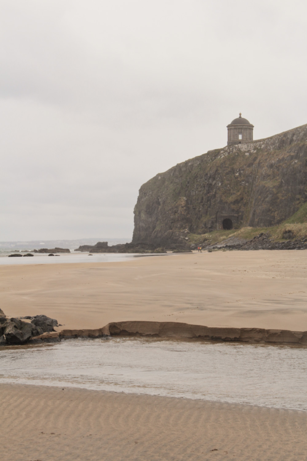 Dernier arrêt sur la Causeway Coastal Route, la plage de Downhill. Nous sommes passés alors dans le comté de Londonderry, de l’autre côté de la rivière Bann. La plage fait 11 km, et particularité qu’on ne trouverait pas en France, on peut aller sur la plage en voiture! Nous nous sommes arrêtés juste à la sortie du village de Castlerock pour admirer la plage de Downhill juste en-dessous du Mussenden Temple. Il a été construit en 1785 en s’inspirant du Temple de Vesta à Rome. C’était une bibliothèque. L’édifice est assez surprenant dans ce paysage irlandais. C’est avec une tempête de sable et une température presque polaire que nous achevons notre road trip…un jour peut-être nous pousserons jusqu’à Derry-Londonderry.