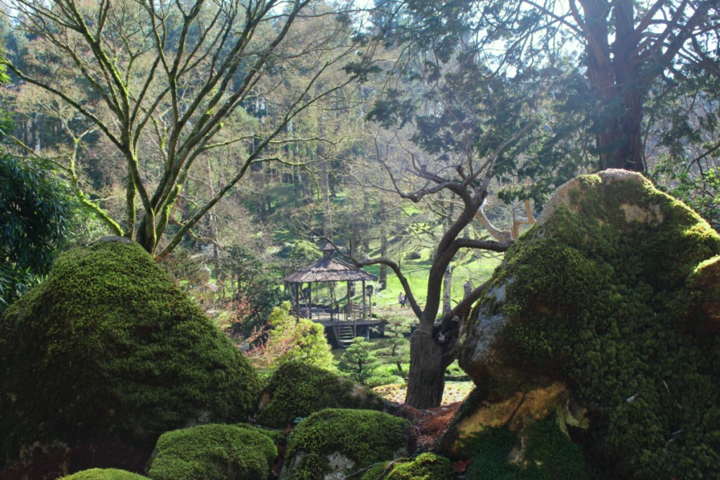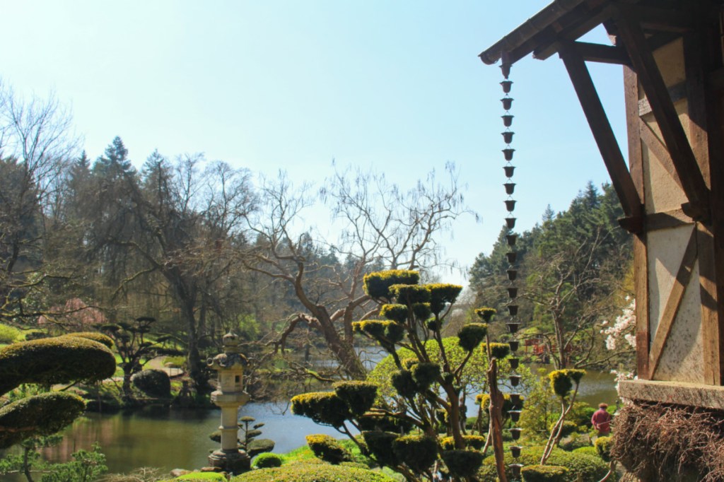 Il y a plusieurs chemins dans le parc, l’étang est entouré de rochers pour avoir une autre perspective. Ces chemins en hauteur donnent une saveur un peu plus contemplative à la visite. Ils invitent à composer son propre tableau naturel entre les rochers et les arbres pour trouver la plus belle vue sur l’étang. Plus bas, les buis sont taillés en forme de nuages, on trouve des lanternes traditionnelles ishi-doro, des sculptures et des structures comme la pagode.