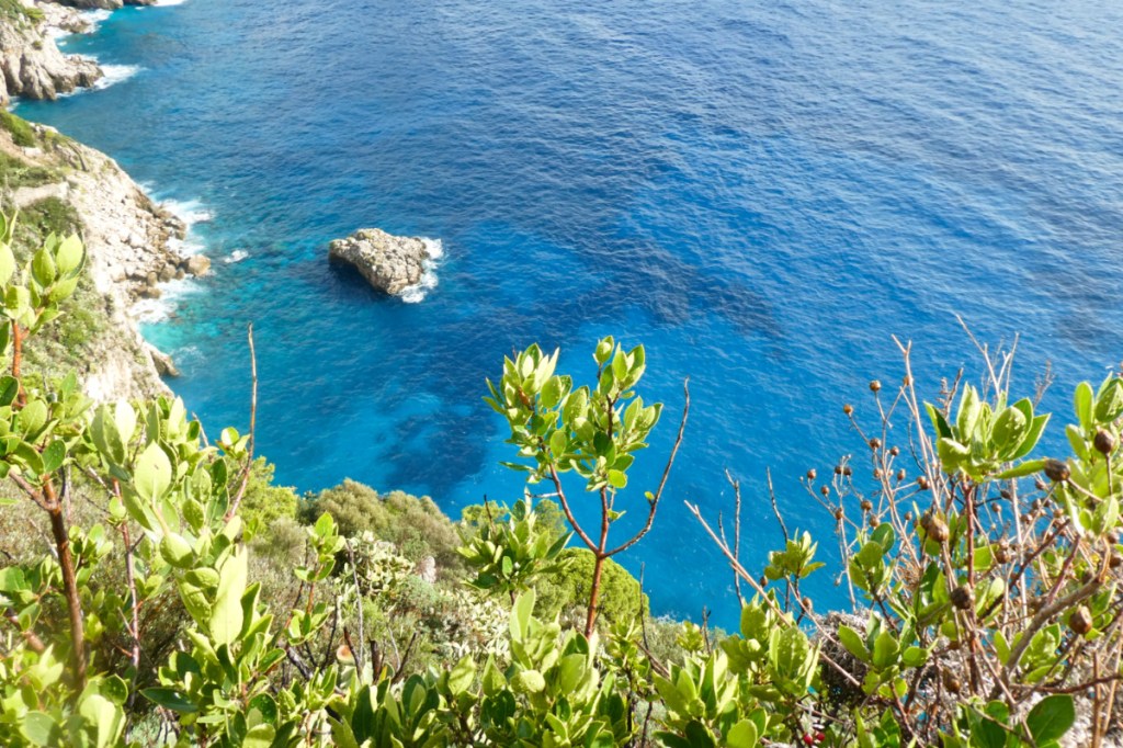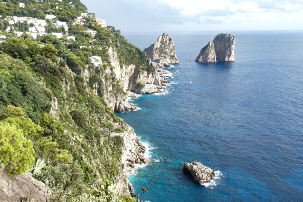 Encore quelques mètres et les rayons de soleil percent le ciel de façon plus prononcée cette fois. Nous arrivons aux jardins d’Auguste, le fameux belvédère que nous cherchions. Il y a parfois des moments de grâce en voyage, et là, juste là, à cet endroit, ce fut un moment parfait. Nous exultons devant la vue magnifique sur les faraglioni. Nous n’arrivons pas à détacher nos regards de ces trois rochers emblématiques de Capri (Stella, Faraglione di mezzo, et Scopolo) et nous félicitons d’être venues malgré la météo.