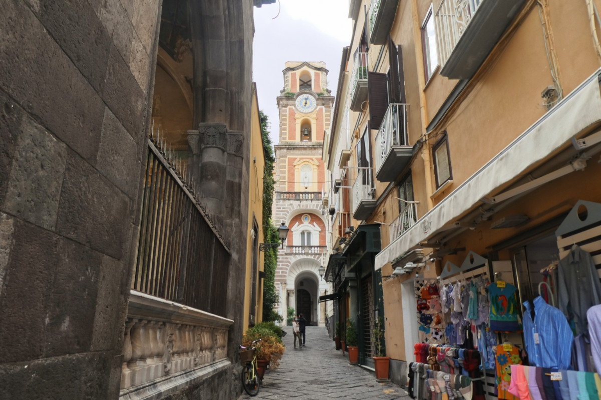 Le quartier du centre-ville autour de la cathédrale est plat avec ses boutiques et ses petites rues. Plus on s’éloigne en direction de la marina grande (l’autre port), plus ça monte, plus les ruelles deviennent étroites et sinueuses. La vue sur la ville et sur la baie vaut le détour. Sorrente est un prélude à la côte amalfitaine de l’autre côté de la péninsule.