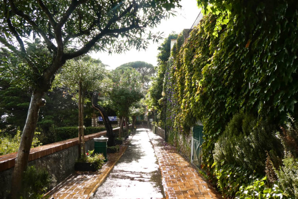 Il est temps d’invoquer Hervé Villard, à situation désespérée, mesures désespérées. Réfugiées sur une petite terrasse en bois à l’abri des gouttes, seules dans la rue, nous nous mettons à chanter « Capri c’est fini » en riant de la situation (ne me remercie pas lecteur/lectrice, tu vas lire le reste de l’article avec cet air dans la tête). Hasard ou réponse divine, toujours est-il qu’au loin un rayon de soleil éclaire soudain l’horizon. Le pari n’est pas gagné, mais tant que la pluie se calme, nous reprenons espoir et notre balade dans les ruelles. Le village piéton est un dédale de ruelles bordées de fleurs, de villas élégantes et hôtels avec terrasses panoramiques.