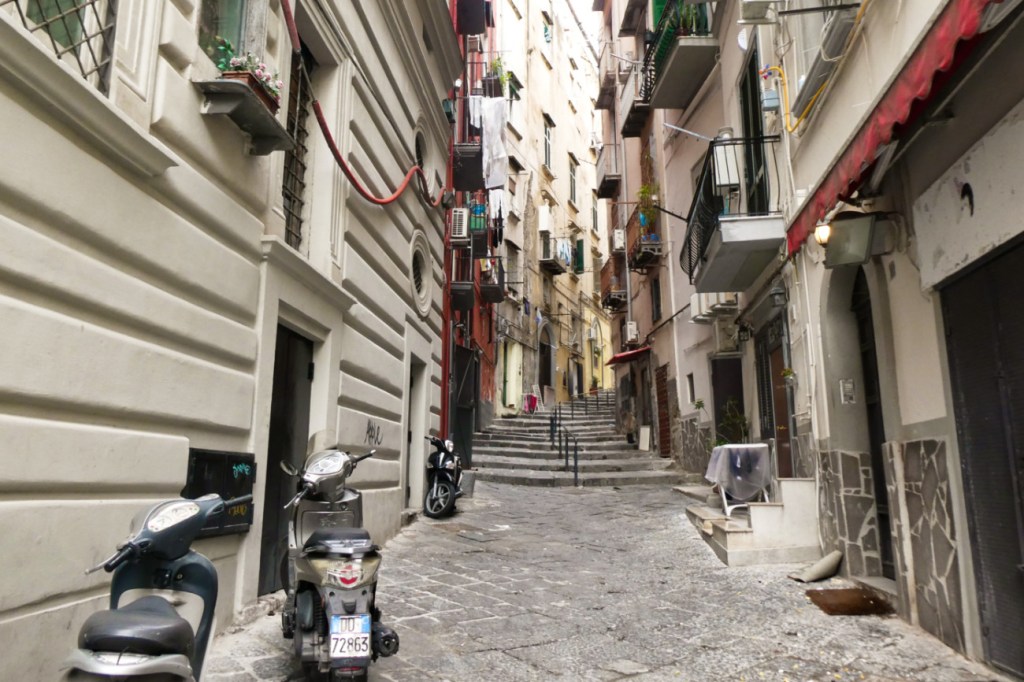 J’ai adoré me promener dans les rues du quartier historique. Notre logement se trouvait tout au nord du quartier, à côté du musée d’art contemporain, nous avons donc pas mal exploré, sans but réel, au gré des rues et des ruelles, jusqu’à Santa Chiara au sud du quartier. La plupart des rues sont piétonnes et pavées. La plupart des bâtiments sont défraichis, certains tombent même en ruines et sont recouverts de filets pour éviter les accidents. On croise beaucoup de petites églises et de places pleines de charme comme la piazza Bellini, la piazza San Domenico Maggiore ou encore la piazza cardinale Sforza. On croise aussi du linge étendu aux fenêtres, pas mal de street art et surtout beaucoup de scooters! L’exploration urbaine est en tout cas très agréable.