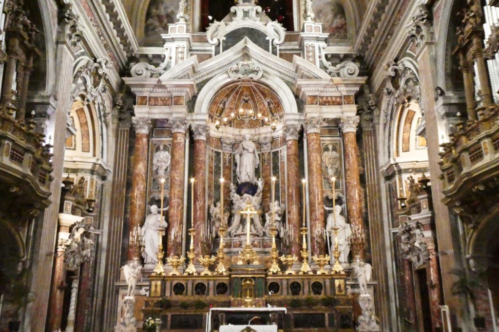 Certes, on a déjà vu plus impressionnant comme cathédrale, et je m’attendais peut-être à plus grand pour une ville si fervente. Elle date du XIVe siècle, mais sa façade ne remonte qu’au XIXe siècle. Si l’extérieur n’a rien d’exceptionnel, il Duomo vaut le coup qu’on passe la porte. Le chœur de la cathédrale est baigné de lumière grâce aux vitraux; c’est une lumière chaude et accueillante. La cathédrale est consacrée à Notre-Dame de l’Assomption, et avec cette lumière et les rais sur la sculpture, on a l’impression que la Vierge du chœur monte directement vers le soleil (ou sûrement vers la lumière divine). Je n’avais jamais vu de tels vitraux, et cette lumière m’a beaucoup touchée. À noter que la cathédrale est aussi connue sous le nom de San Gennaro, le saint patron de Naples dont elle abrite les reliques.