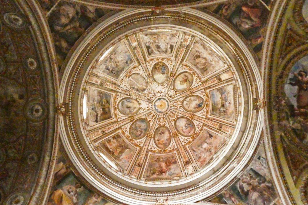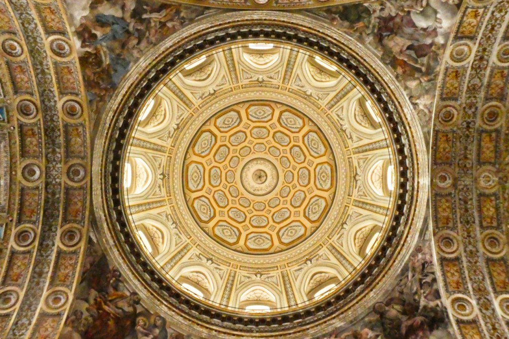 C’est de loin la façade d’église la plus vilaine que j’ai vue. Je n’avais d’ailleurs pas réalisé qu’il s’agissait d’une église. Et pour cause! Cette façade appartenait à un palais du XVe siècle. Il fut confisqué par les Espagnols qui occupaient la ville au XVIe siècle puis revendu aux Jésuites. Après d’importants travaux, l’église est consacrée en 1601. Seule la façade du palais demeure. Cette façade couverte de petites pyramides m’a intriguée…et la porte était ouverte. L’intérieur baroque chargé est aux antipodes de ce que je pensais trouver derrière cette façade hideuse. C’est surchargé, chaque centimètre carré est décoré, mais on ne peut être qu’impressionné en passant la porte.