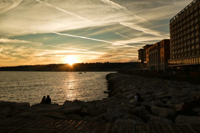 Arrivées enfin en bas de la colline, c’est la mer qui nous a appelées. Le quartier de Chiaia est élégant avec de grandes rues et contraste un peu avec les ruelles typiques de Vomero. Nous avons traversé le long parc de la villa comunale, qui prenait un air de station balnéaire lorsque nous nous faisions doubler par des rosalies. La plage de Mappatella est une minuscule plage de sable noir volcanique avec une vue imprenable sur le castel dell’Ovo. Quelques Napolitains en maillot flânaient encore au bord de l’eau en ce mois d’octobre (dont, évidemment, un sosie d’Aldo Maccione qui nous a fait sourire). Le soleil commençant à se coucher, nous sommes revenues vers le centre en longeant le bord de mer. Le front de mer grouillait de monde en terrasse, de touristes aussi et baignait de soleil.