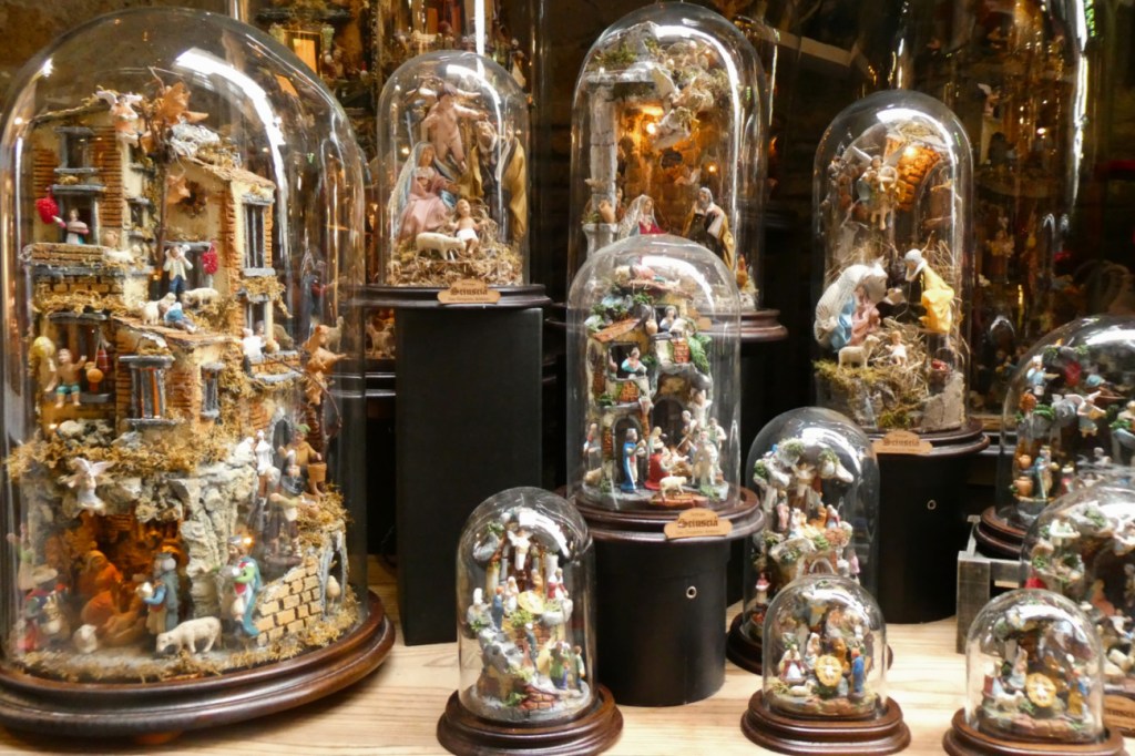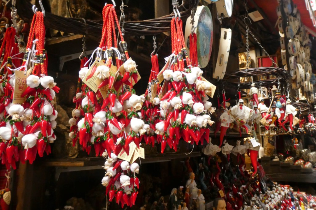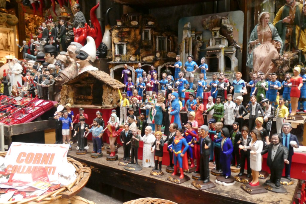 C’est la rue des touristes! Nous nous y sommes trouvées un peu par hasard, emportées par la foule de touristes. Traditionnellement, on y trouve les boutiques de crèches et de santons de Noël qui ont fait la réputation de la ville. Néanmoins, la rue grouille de touristes toute l’année et vous pouvez faire votre shopping de Noël même en été. Si on y trouve encore des crèches traditionnelles, on y trouve aussi beaucoup de santons modernes à l’effigie du dieu de Naples Maradona (et tous les autres joueurs de football), Freddy Mercury, Luciano Pavarotti ou Superman. On y trouve également toutes les babioles à touristes comme les piments, symboles de la ville, sous toutes leurs formes. Ils sont censés protéger du mauvais œil.