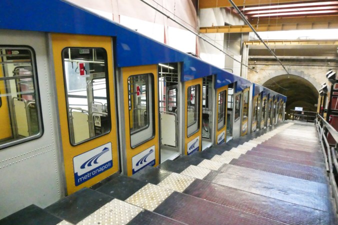 Si nous avons commencé notre visite de Naples au château Sant’Elmo, c’est surtout pour la vue! Situé sur la colline de Vomero, le moyen le plus simple d’y accéder est par le funiculaire à partir de la jolie station de Montesanto. C’est déjà une petite expérience. Sant’Elmo est une véritable forteresse aux murs épais.