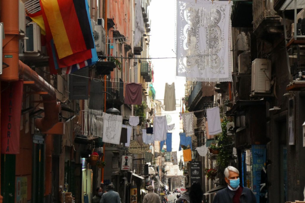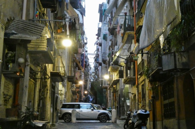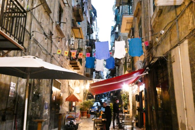 À la sortie du métro Toledo, on se trouve au pied des sulfureux quartiers espagnols. Ils doivent leur nom aux soldats espagnols qui avaient construit et vivaient dans ce nouveau quartier au XVIe siècle lorsque la ville appartenait à la couronne espagnole. Nous n’avons passé qu’une heure dans les quartiers espagnols, la nuit tombait et il pleuvait, en somme, ce n’étaient pas les meilleures conditions. C’est probablement le quartier le plus emblématique de Naples et celui qui a la plus mauvaise réputation. On le décrit comme dangereux, gangréné par la mafia. Or, il ne faut pas craindre de s’aventurer dans ses rues quadrillées. C’est ici que bat le cœur de Naples, parmi les minuscules restaurants populaires, les lignes de linge accrochées aux fenêtres, les Napolitains qui circulent dans les ruelles où seuls les scooters peuvent passer (et les Fiat 500, tout est dans le cliché!) .