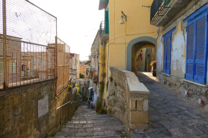 Plutôt que de reprendre le funiculaire pour descendre, on s’est dit qu’on pouvait descendre sur l’autre versant jusqu’à la mer. Sur le plan, ça paraissait une bonne idée, Googlemap nous indiquait une demi-heure à pied. En réalité, avec mon genou qui part en vrille dès qu’il faut descendre, il nous aura fallu une bonne heure. Mon genou n’aura pas résisté, mais je ne regrette pas. Dans ces ruelles pleines de charme, aucun touriste à l’horizon. J’ai vraiment adoré traverser ce quartier, sans voiture, authentique, avec vue sur la mer.