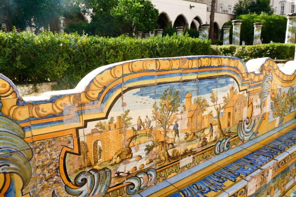 L’ensemble monastique de Santa Chiara est un véritable havre de paix au milieu de la ville vrombissante. Le complexe comprend une église, un monastère et un couvent. Il fut construit au XIVe siècle par le roi de Naples, Robert d’Anjou et sa femme Sancia de Majorque. L’église a été largement détruite pendant la Seconde Guerre mondiale, mais a été reconstruite à l’identique. Le cloître du XVIIe siècle est étonnamment calme et serein. Il est assez surprenant également par sa décoration de 72 piliers, murets et bancs en faïence peints. Ils m’ont fait penser aux azulejos portugais.