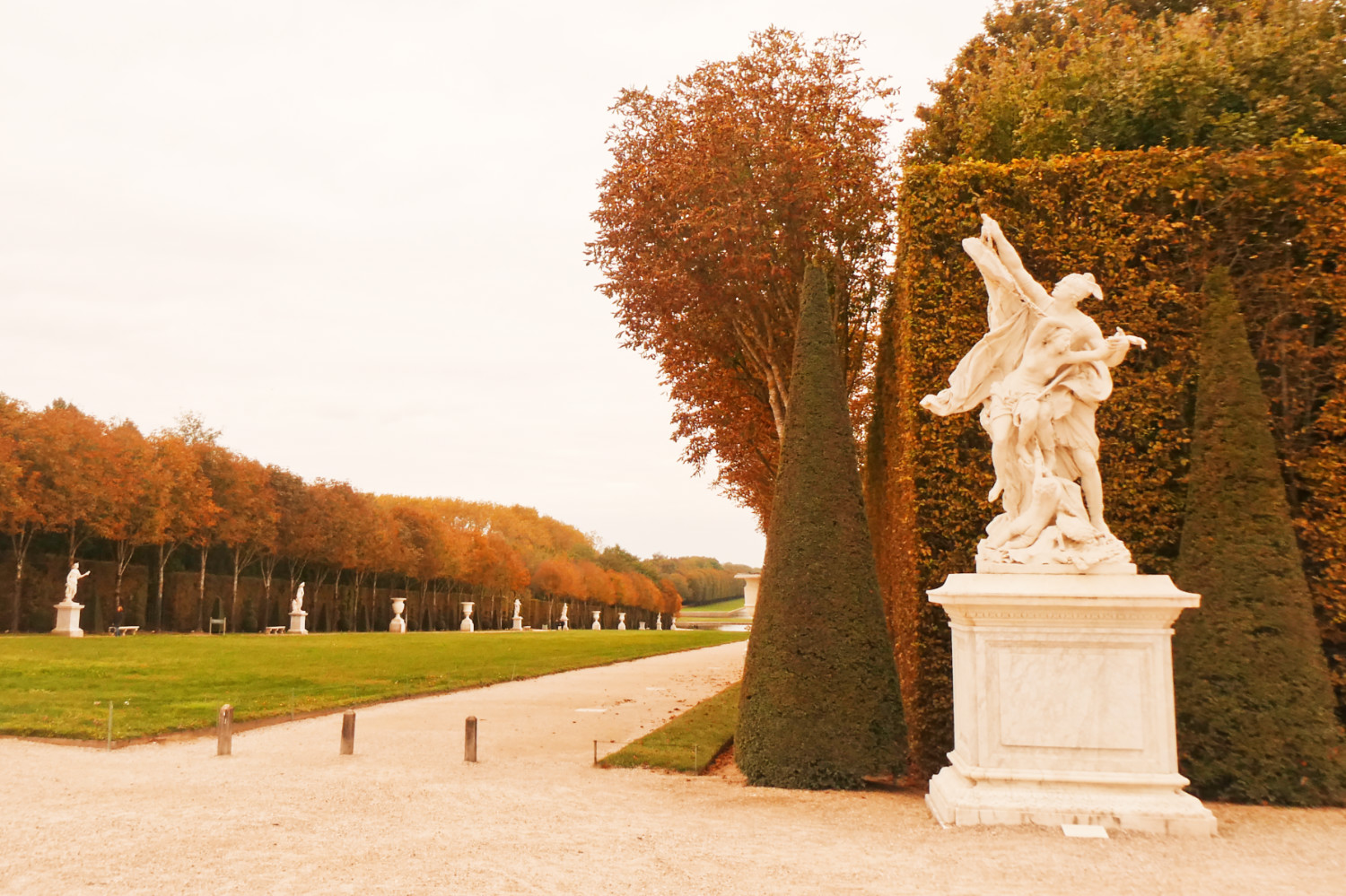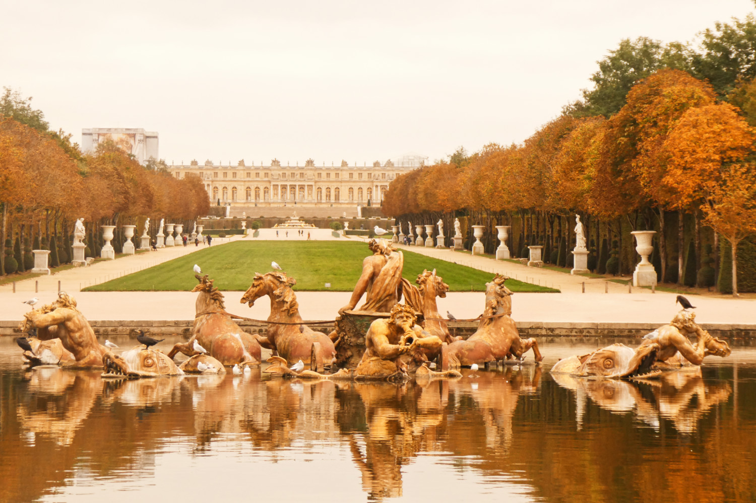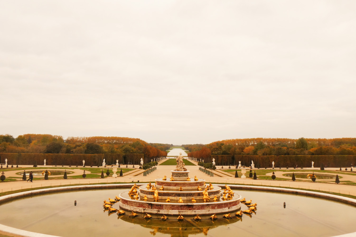 Il faut certainement plusieurs visites pour pouvoir faire le tour de tout le domaine. Je n’ai malheureusement pas eu le temps d’aller jusqu’aux châteaux de Trianon ni au hameau de la reine. Cependant, j’ai profité des jardins sans personne. Malgré le ciel morose, il régnait une atmosphère calme et chaleureusement automnale dans les jardins. Les arbres commençaient à afficher fièrement leurs couleurs d’automne et j’étais presque seule pour les admirer.