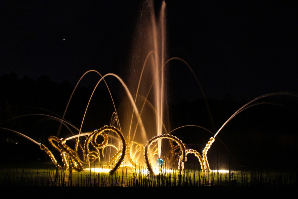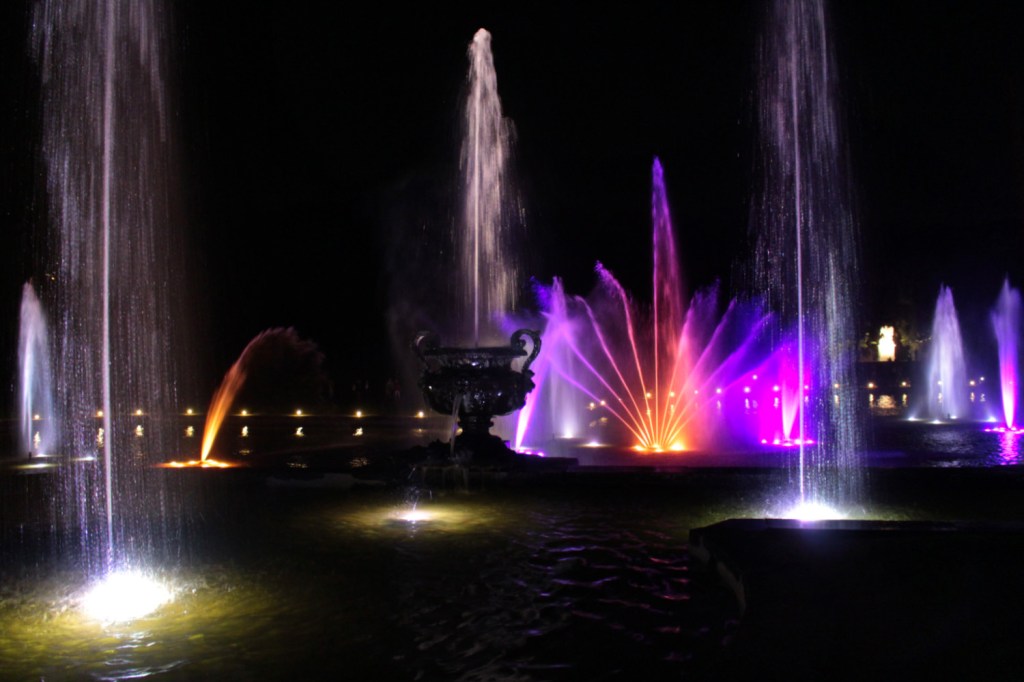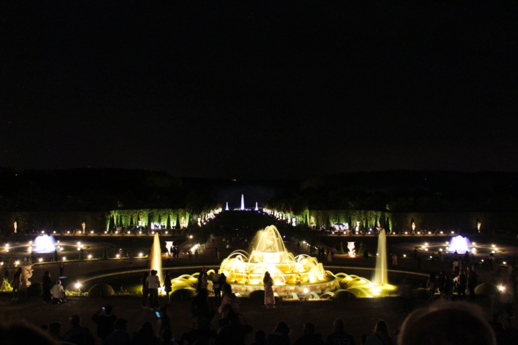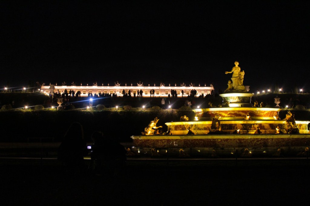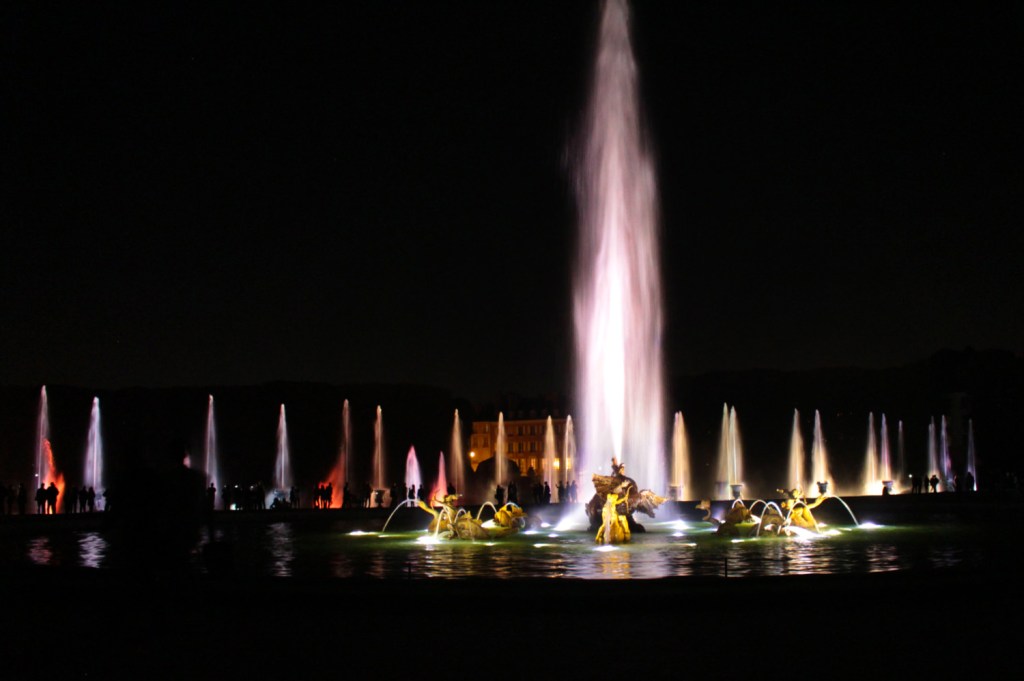 Au-delà de ce ressenti un peu négatif, la visite nocturne est impressionnante. J’ai trouvé que les illuminations sur le château lui donnaient une dimension encore plus majestueuse que le voir de jour. On se sent un peu comme à la cour de Louis XIV avec la musique de Lully. Il y a beaucoup de bosquets dans lesquels se perdre, trop pour le temps imparti de la visite (2h30), il faut donc faire des choix. Nous n’avons pu faire que la moitié nord. Certains bassins, comme celui de Neptune, ont un petit spectacle toutes les 15 minutes, d’autres sont illuminés en permanence.