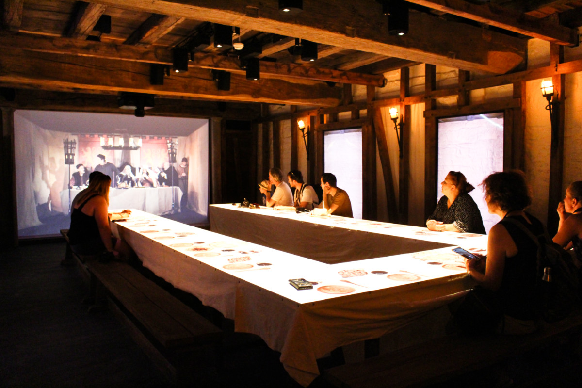 Après avoir traversé la cour du château, nous sommes invités au banquet d’Aliénor. Cette reconstitution prend vie grâce aux tables animées par un mapping, aux écrans derrière nous sur lesquels défilent des personnages médiévaux et bien sûr grâce à l’apparition de la reine elle-même. Il manquait juste un vrai verre d’hydromel pour nous y croire!