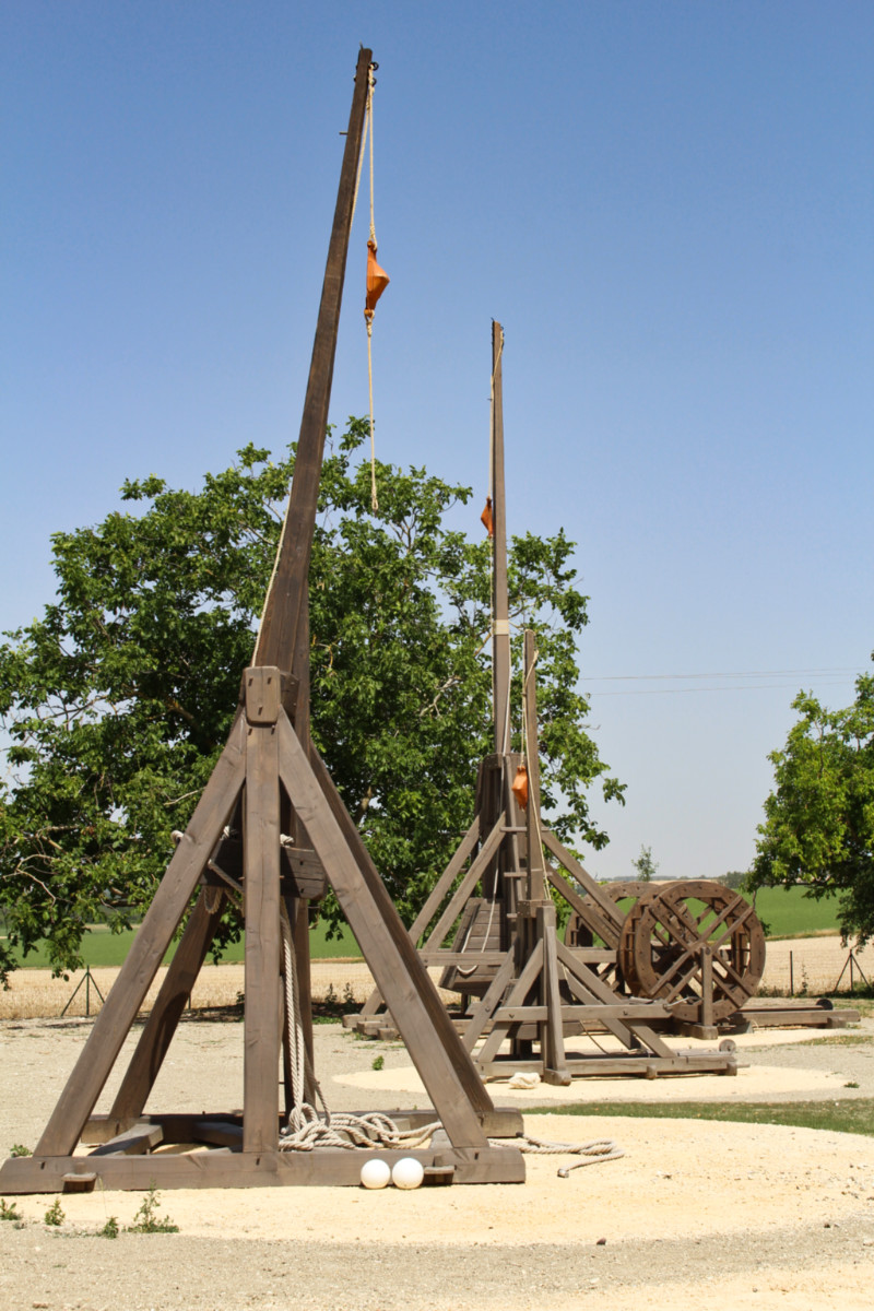 C’est sous une chaleur de plomb que je découvre l’extérieur du château. Par 40°C, il est difficile de faire les activités en plein air. Il y a pourtant beaucoup à faire avec des jeux de société médiévaux sous des tentes, des jeux d’adresse, de construction, et même un parcours acrobatique pour chevaliers en herbe. On peut même apprendre à tirer à l’arbalète. Cependant, on est tout de suite attiré par les trois machines impressionnantes dans la cour: le trébuchet, le couillard et la bricole. Avec l’aide de l’équipe du château, on s’essaie même à un tir de bricole, tir réussi puisque nous avons réussi à envoyé le ballon dans le champ voisin! Rien de tel qu’expérimenter l’Histoire!