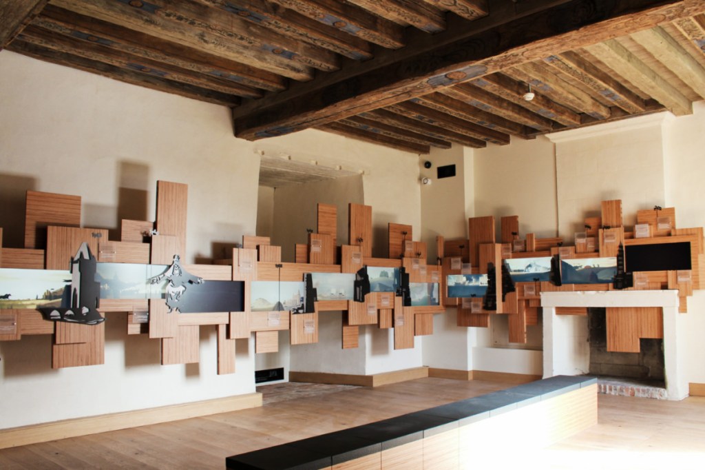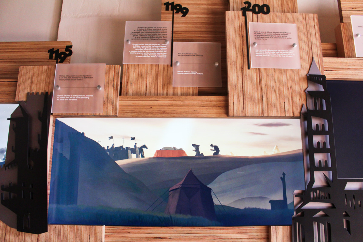 La visite débute en compagnie de la célèbre Aliénor d’Aquitaine et de son fils le roi Richard Cœur de Lion. Comment passer à côté de l’histoire d’Aliénor, reine de France (épouse de Louis VII) puis d’Angleterre (épouse d’Henri II Plantagenêt) ? Duchesse d’Aquitaine et comtesse de Poitiers, cette femme de caractère et de pouvoir a marqué le Moyen Âge comme aucune autre. J’ai toujours trouvé son histoire fascinante, une femme puissante qui n’hésitait pas à aller chercher ce qu’elle voulait. Elle demeure une figure emblématique de la région. L’histoire d’Aliénor et de Richard se raconte comme un livre ouvert à travers une douzaine d’écrans aux magnifiques illustrations qui retracent les moments importants de leurs vies. Aliénor repose d’ailleurs à quelques kilomètres de Monts-sur-Guesnes, à l’abbaye royale de Fontevraud.