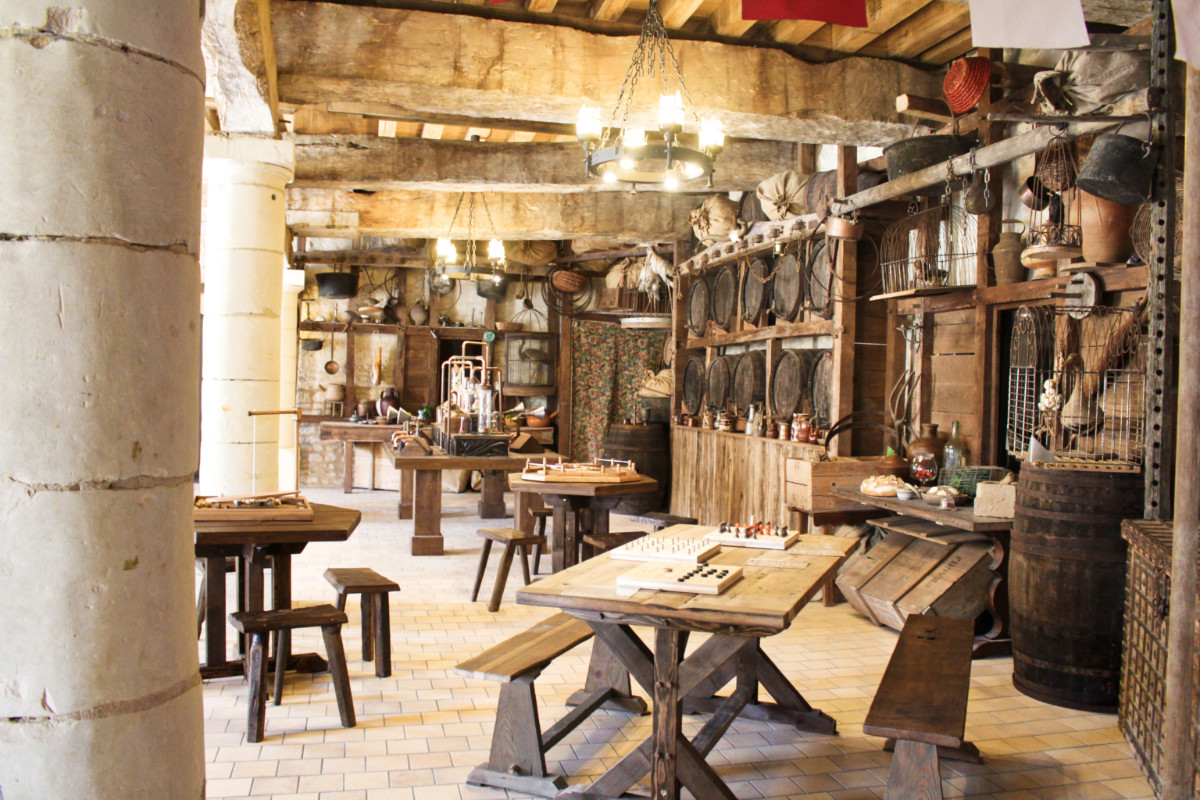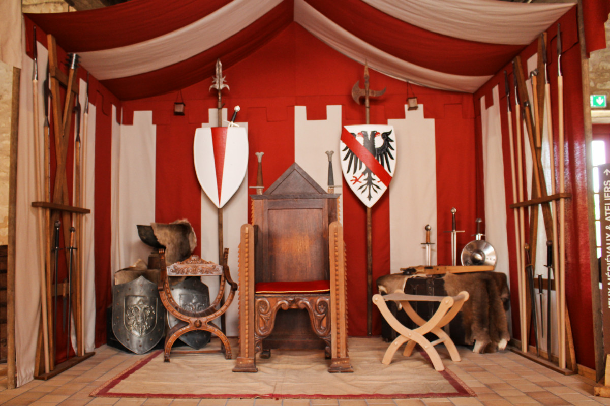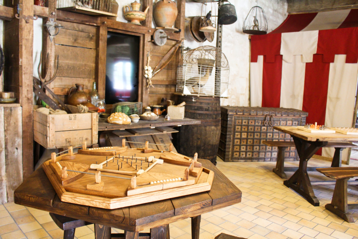 La dernière grande salle est le salle de jeux. Soigneusement décorée, on peut découvrir des jeux de société médiévaux comme l’ancêtre du jeu de dames. L’équipe du château explique patiemment comment jouer à tous ces jeux qui ont pour la plupart disparu aujourd’hui. Il y a aussi une table interactive olfactive pour deviner les épices de l’époque. On peut aussi se déguiser en gente dame et gentilhomme histoire de faire une photo sur le trône prévu à cet effet, ou simplement se rendre compte du poids d’un casque de chevalier (ma grande frustration de la visite est de ne pas avoir eu le temps de le faire!).