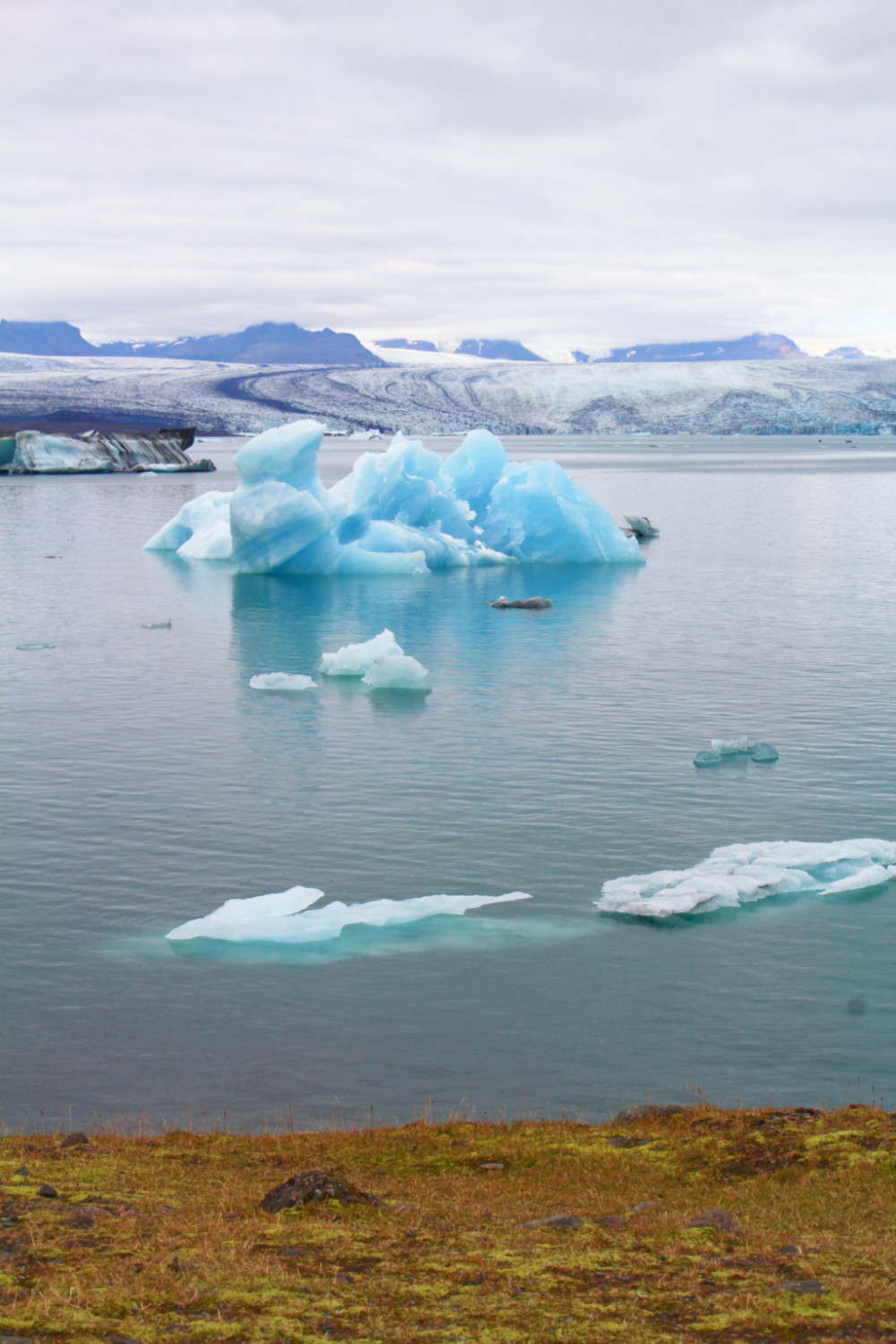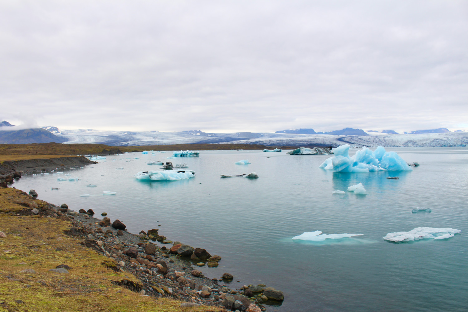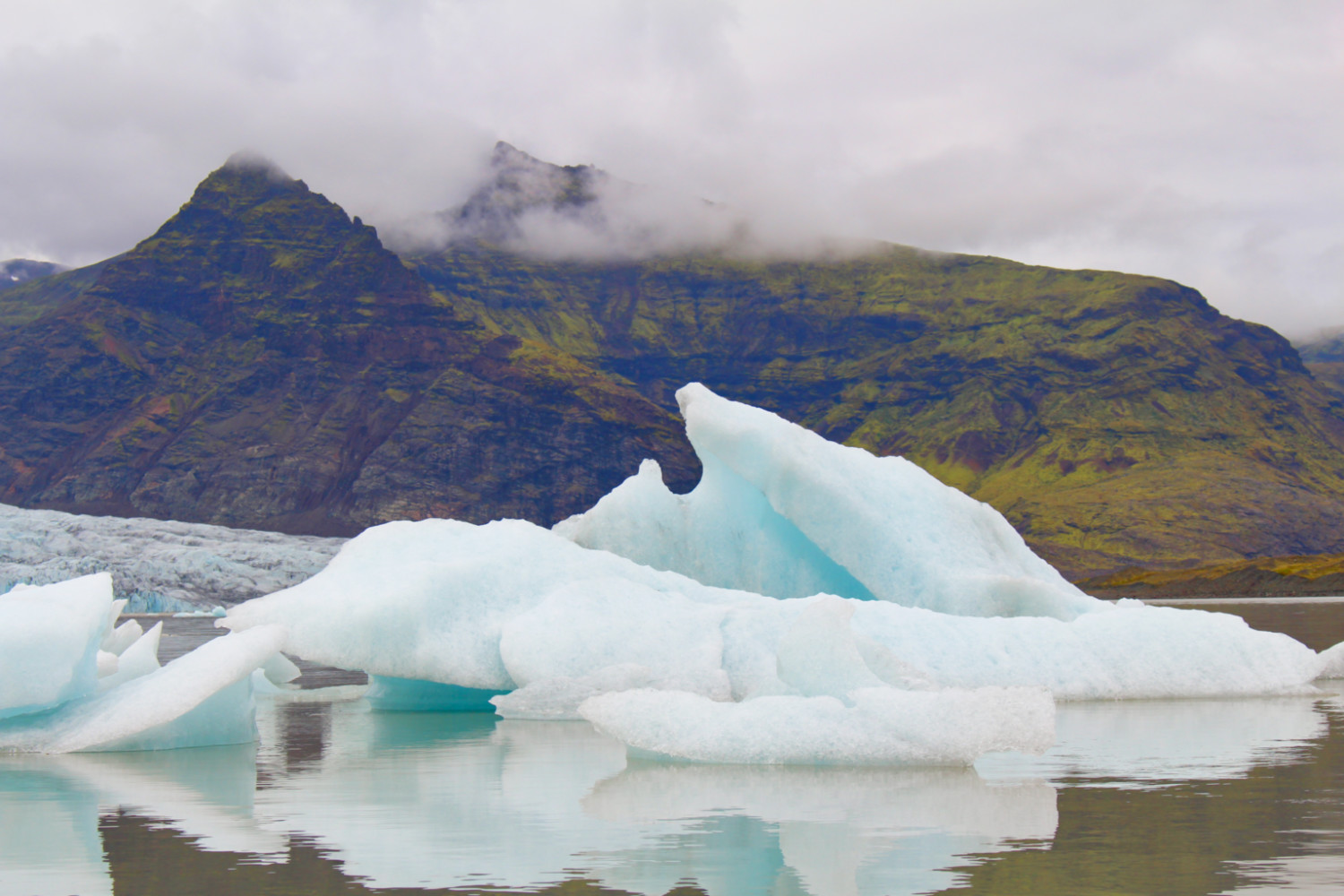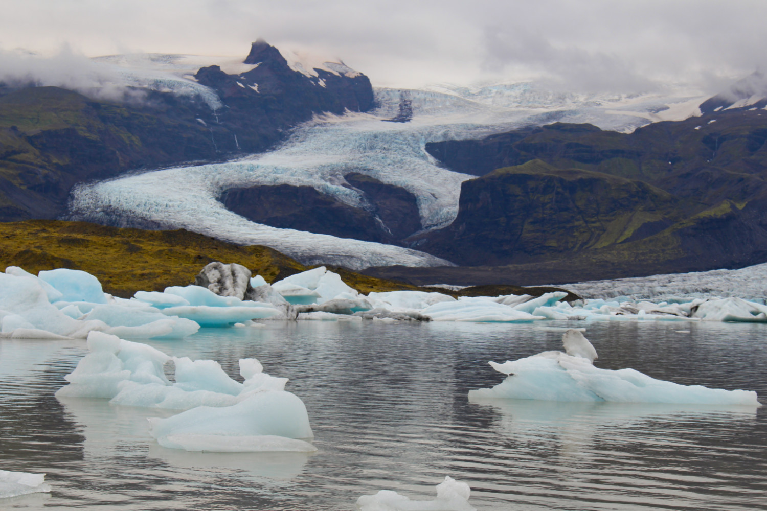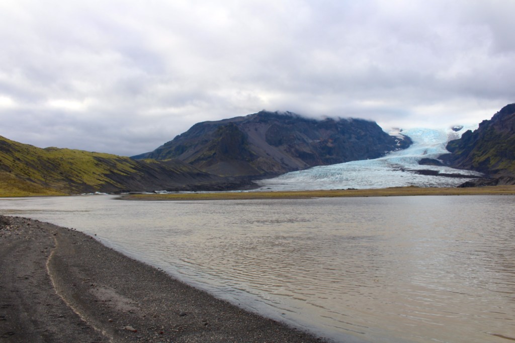 Jökulsárlón étant le point le plus à l’est de notre voyage, je réalisais alors que nous n’irions pas plus loin. Nous allions reprendre la même route dans l’autre sens avec un petit goût, déjà, de fin d’aventure. Et même s’il nous restait encore beaucoup à voir, il y aurait peut-être moins ce goût de découverte en terre inconnue. Alors, j’ai voulu faire traîner les choses. Une quinzaine de kilomètres plus loin sur la route du retour, nous nous sommes arrêtées à Fjallsárlón, une autre langue du glacier Vatnajökull. Le glacier était ici plus près et plus impressionnant qu’à Jökulsárlón, un véritable mur de glace qui se jetait dans un petit lac. Un petit air de Game of Thrones. Les icebergs étaient également plus nombreux, mais plus petits. Ici, pas d’excursion en bateau. Des nuages s’accrochaient aux montagnes, des icebergs prenaient la forme des montagnes en arrière plan, un cœur se dessinait en trompe l’œil avec les langues du glacier. J’avais toujours du mal à croire ce qui se trouvait devant mes yeux. J’étais littéralement hypnotisée.