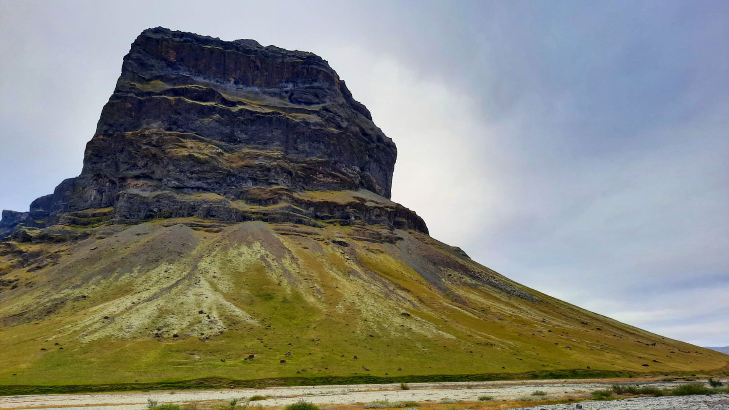 Nous avions ensuite presque deux heures de route pour revenir jusqu’à Vik, où nous dormions dans la même auberge de jeunesse que deux jours auparavant. Cela avait beau être la même route que la veille, le ciel était moins bas, même si l’atmosphère restait dramatique. Cela nous a permis de voir Lómagnúpur, imposant rocher de plus de 700 m de haut qui domine la route 1 que le brouillard avait complètement recouvert et fait disparaître du paysage lors de notre premier passage.