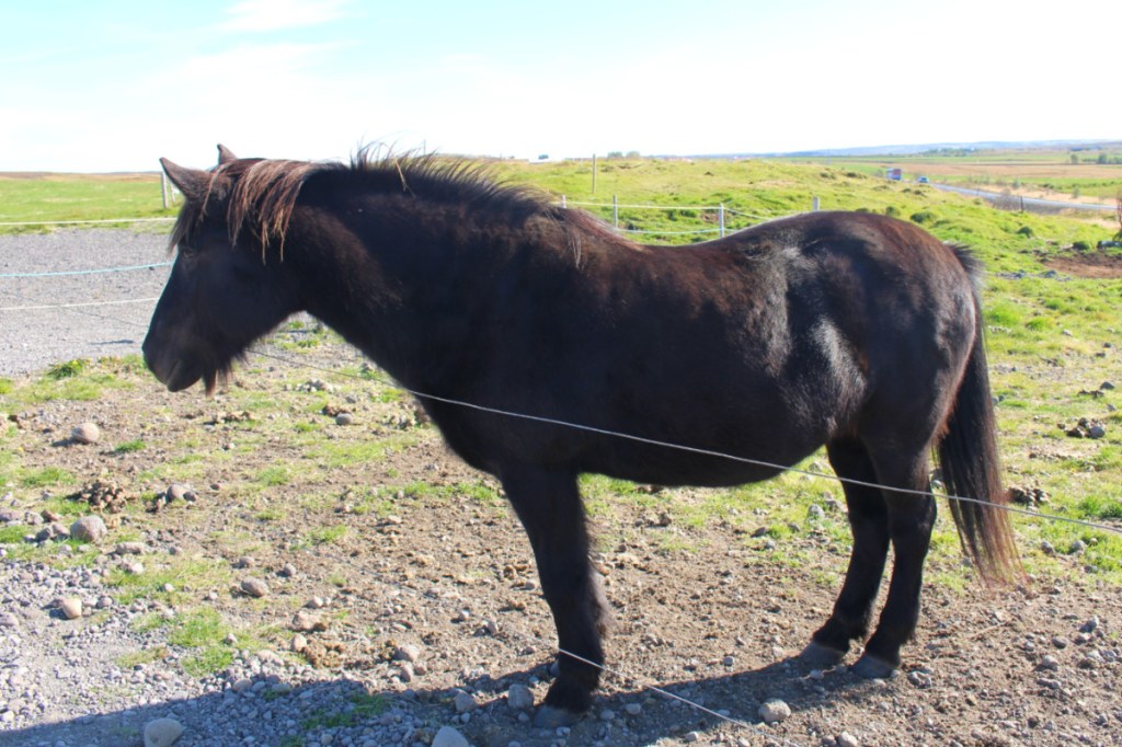 Quelques kilomètres plus loin sur la route 35, nous nous sommes arrêtées près d’une ferme de chevaux islandais. J’étais contente de pouvoir enfin en approcher. Si nous en avions vu tous les jours au milieu de divers paysages, même dans les champs de lave, nous n’avions pas pu les voir de près. Certes, il y en avait moins que des moutons, mais les voir en totale liberté fut quelque chose d’étonnant. Il s’agit d’une race endémique de petite taille et dont la caractéristique est de posséder cinq allures au lieu de trois.