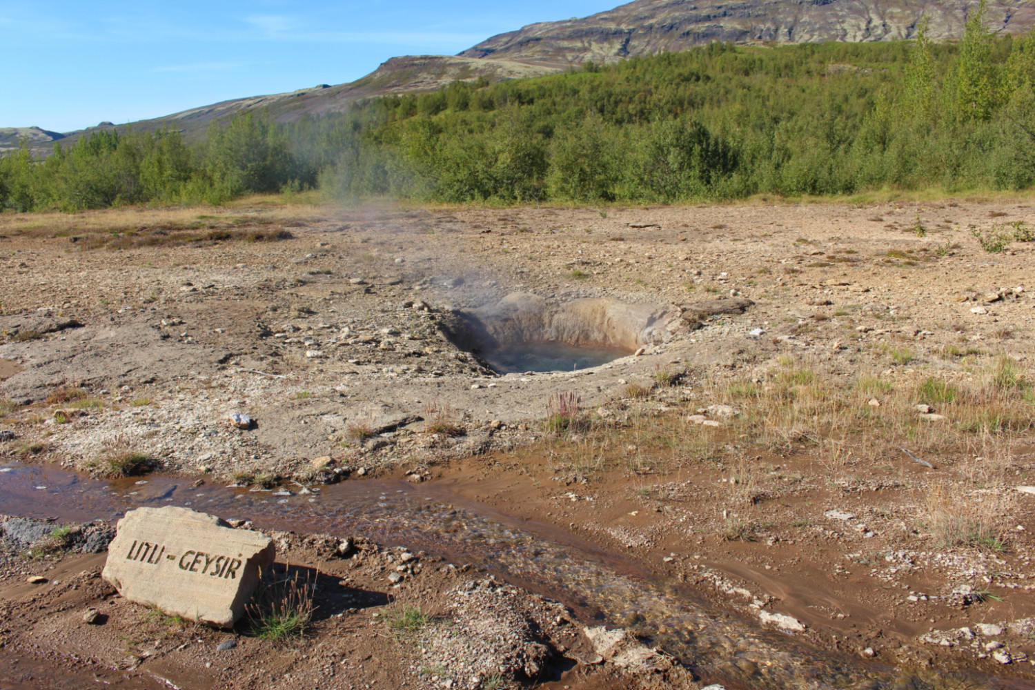 À peine 10 min de route séparent les sites de Gullfoss et Geysir. En arrivant à Geysir (prononcez « guèsir »), nous avons vite compris que là non plus, nous ne serions pas seules sur le site. Le parking était complet et vu la taille du tourist center, nous étions bien dans un des hauts lieux du tourisme du pays. Ce qui nous a frappées en premier en arrivant, c’est l’odeur d’œuf pourri. L’eau serpentant le site était à plus de 80°C, mieux valait donc ne pas y tremper les doigts. Le geyser original, Geysir, qui a donné son nom au phénomène, est désormais endormi. Mais un autre geyser, du nom de Strokkur, jaillit de façon régulière, plus ou moins haut, toutes les 8 à 10 minutes. Il suffisait d’attendre. Même s’il jaillit moins haut que Geysir, l’eau peut monter jusqu’à 30 m.
