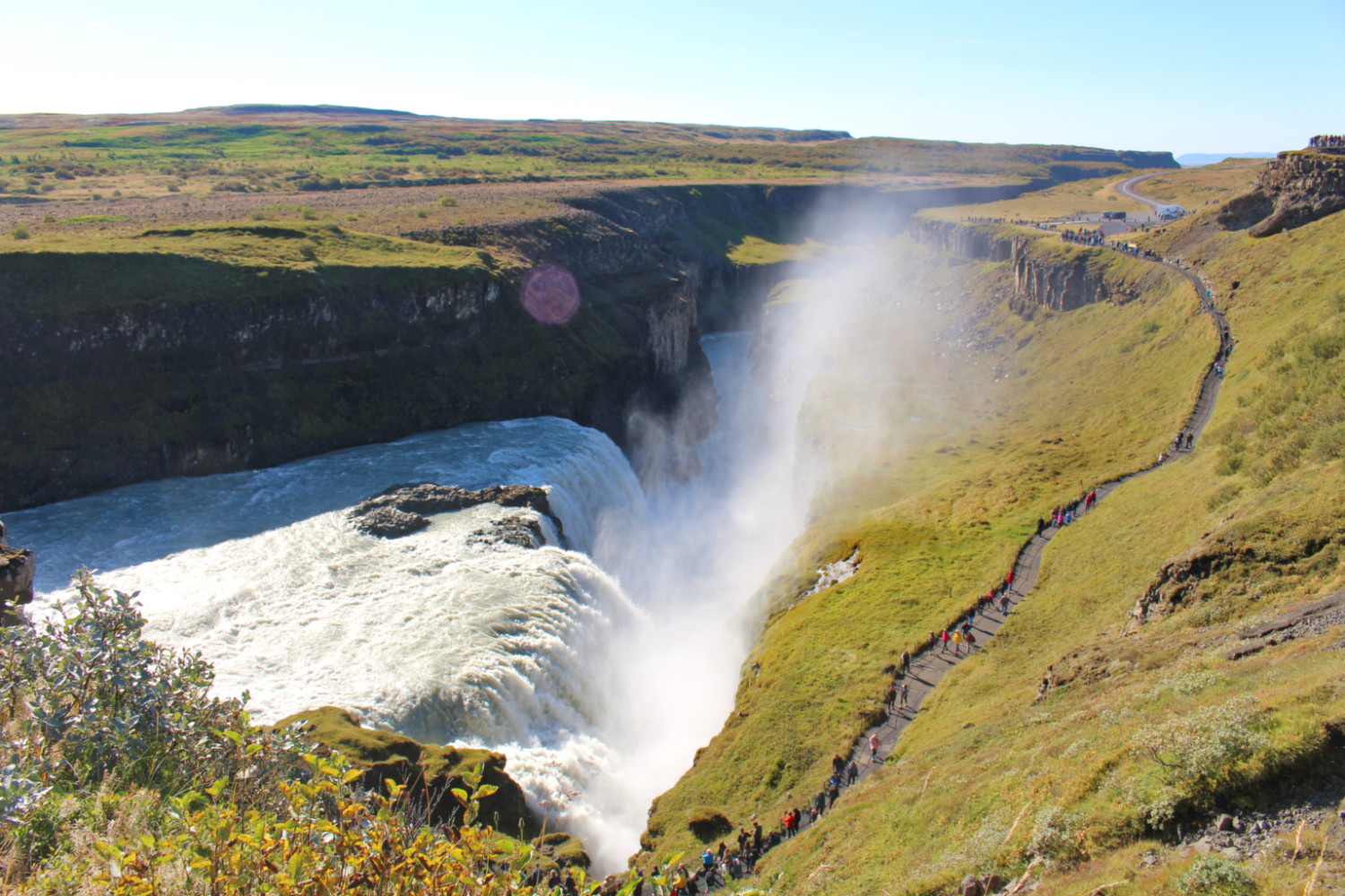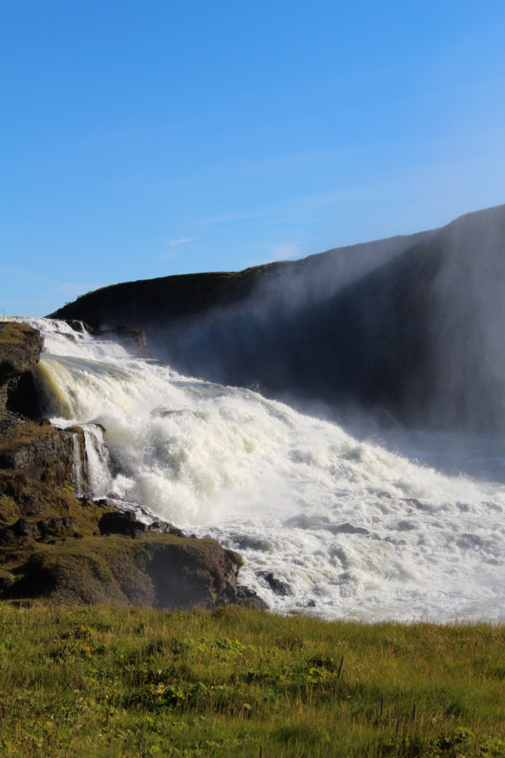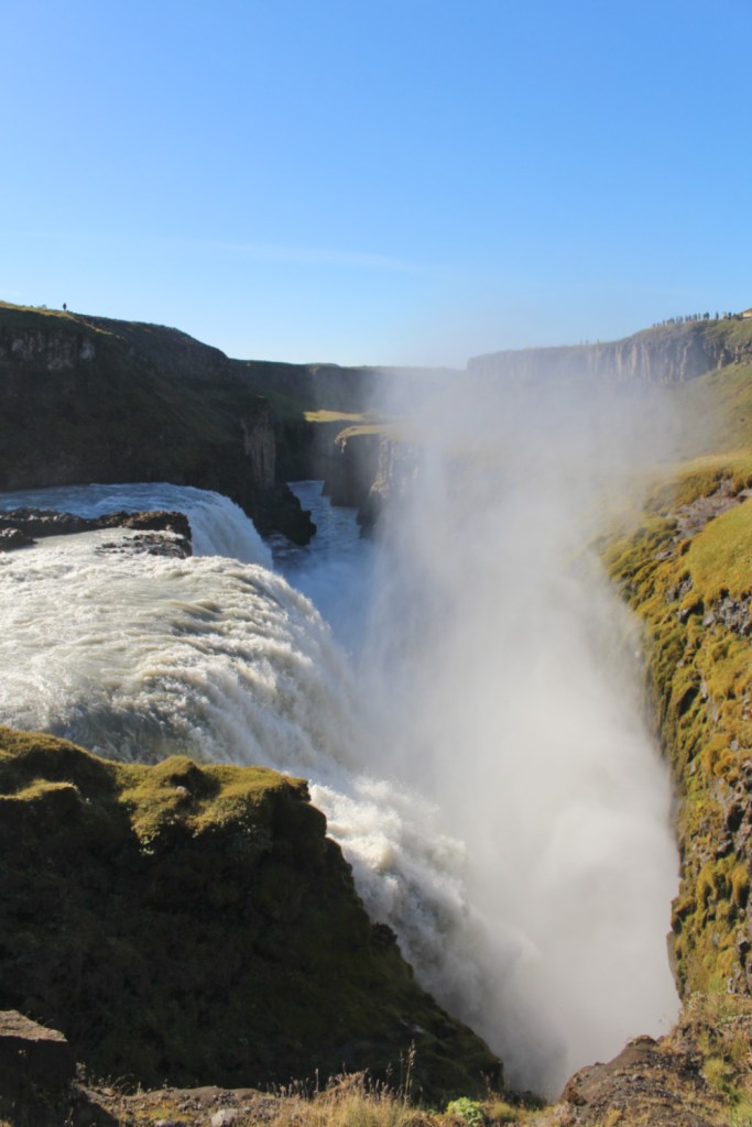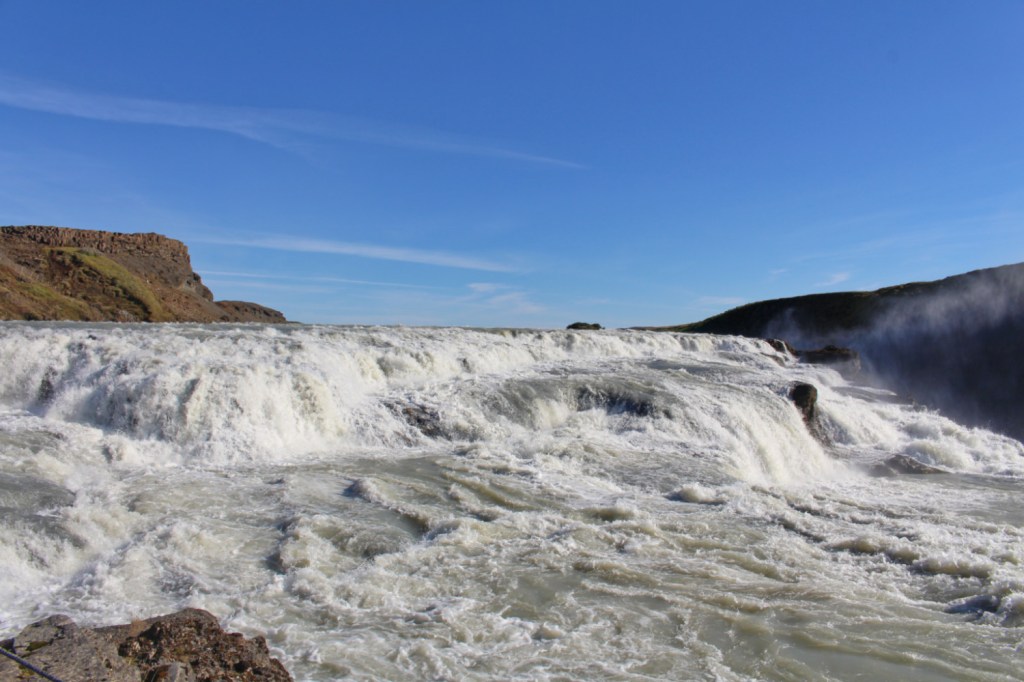 Gullfoss signifie « les chutes d’or » en islandais. Il s’agit d’une cascade à deux étages de 32 m de haut. On l’entend avant de la voir. Nous avons rejoint la file indienne des touristes qui mène au plus près des chutes. La rivière tombait par palier dans un ravin si étroit que nous n’en voyions pas le fond, dans un fracas si puissant que le nuage de vapeur qui s’en échappait nous caressait les cheveux. Plus que le paysage, c’est peut-être le battement assourdissant des chutes qui nous a le plus impressionnées.