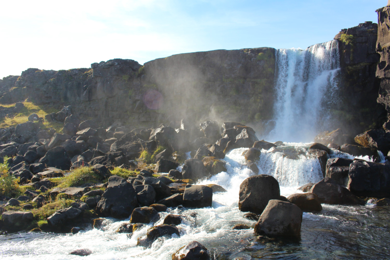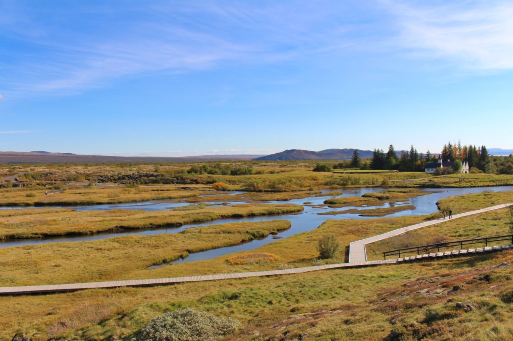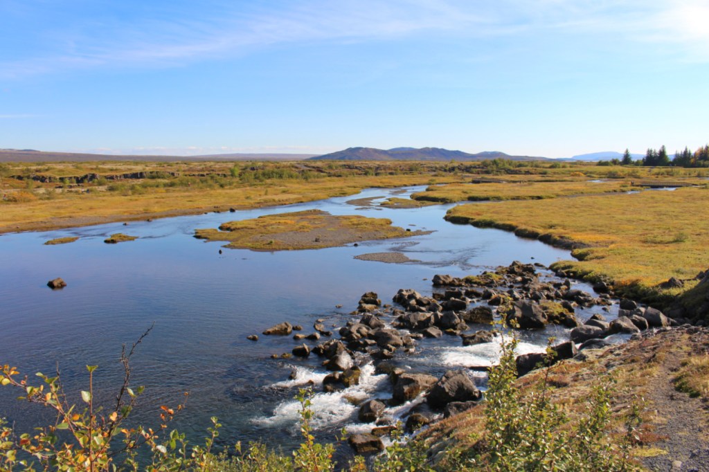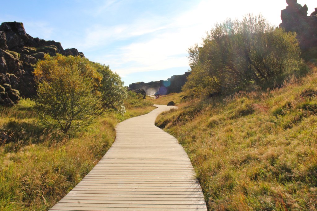 Þingvellir, en plus d’être un lieu historiquement important, est un site naturel exceptionnel. Le parc en lui-même est remarquable, il est traversé par une faille géologique entre les deux plaques tectoniques eurasienne et nord-américaine. Nous marchions donc entre deux continents. Le symbole est fascinant. Les deux plaques continuent de s’éloigner d’environ 2 cm par an et lorsqu’on domine la faille, on se prend à imaginer les paysage futur.