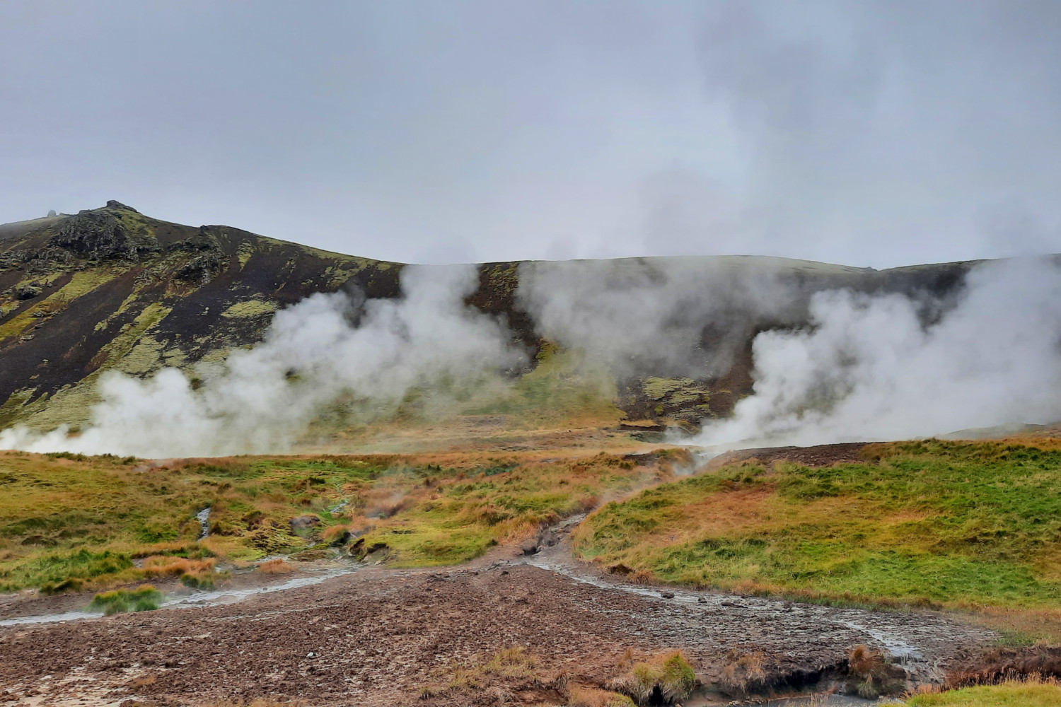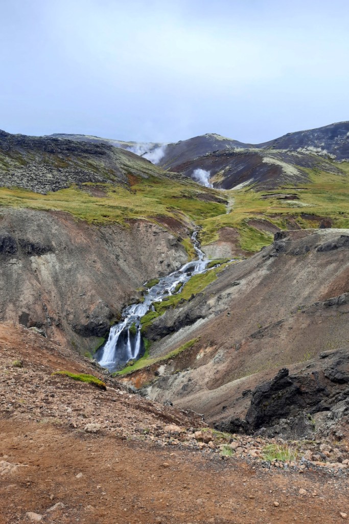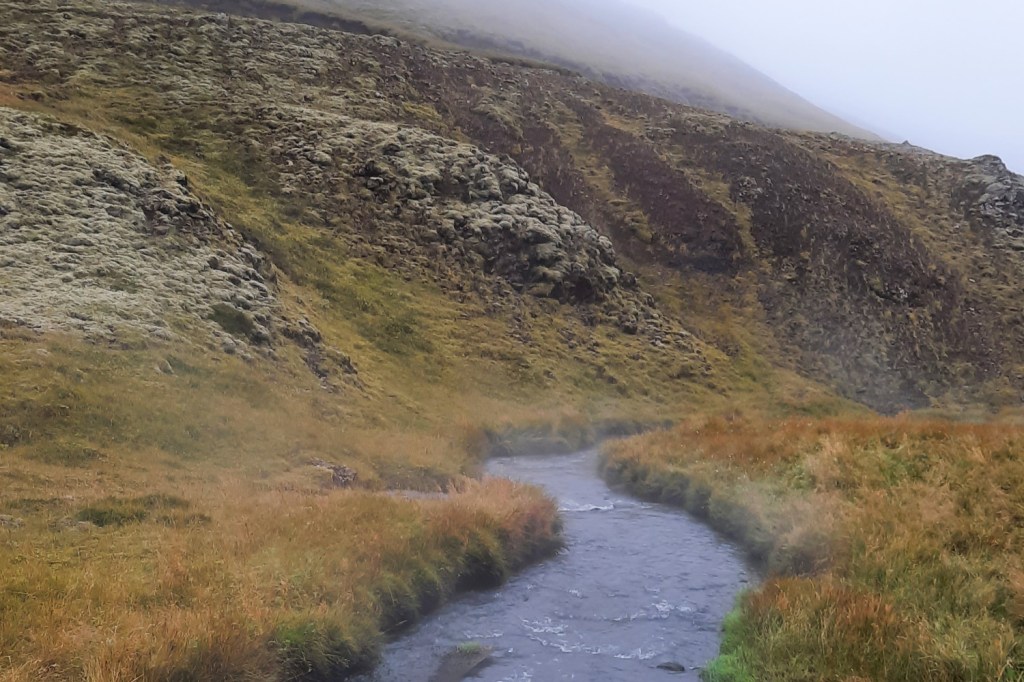 Nous avons profité ensuite d’être « en ville » pour faire quelques courses alimentaires, le plein de la voiture et ramener quelques souvenirs. L’objectif du jour était d’aller faire trempette dans la nature, trouver une source d’eau chaude au milieu des montagnes. Nous ne voulions pas faire l’expérience des sources payantes et touristiques qui ont, certes, l’air accueillantes, mais qui ne nous attiraient pas vraiment. Nous avions donc jeté notre dévolu sur les sources de Reykjadalur. Après avoir pique-niqué au bord de la rivière à Hveragerði en regardant des pêcheurs se geler au pied de la cascade Reykjafoss, nous sommes donc parties en périphérie de la ville à la recherche de la source. Le GPS ne nous a pas vraiment aidées cette fois-ci. Nous avons fini par trouver le parking (payant) et le début du chemin. C’était parti pour une heure de grimpette au milieu d’une vallée fumante (6 km aller-retour) aux airs de Mordor. J’avais vraiment l’impression d’être sur une autre planète dans ce paysage rouge, aride, parsemé des colonnes de fumée. Au début de la randonnée, nous avons pu nous approcher d’une cavité bouillonnante, des bulles de boue en sortaient avec une odeur de souffre très forte. À ce paysage inquiétant, il fallait ajouter des petits insectes vicieux par milliers qui s’amusaient à rentrer dans la bouche, les oreilles, les narines, sous les lunettes, telles les midges, les fameux moucherons écossais. Toutes les personnes montant sur le chemin se donnaient en spectacle dans de grandes gesticulations pour éloigner les rykmý. J’ai opté pour la chorégraphie de l’hélicoptère grâce à mon écharpe, avec plus ou moins de succès. Cela a beaucoup fait rire les personnes que nous croisions dans le sens inverse, et plusieurs nous disaient la même chose pour nous rassurer: « there’s no bugs on the way down! » , il n’y en a pas dans la descente (ce qui s’est révélé vrai! Encore un mystère islandais).