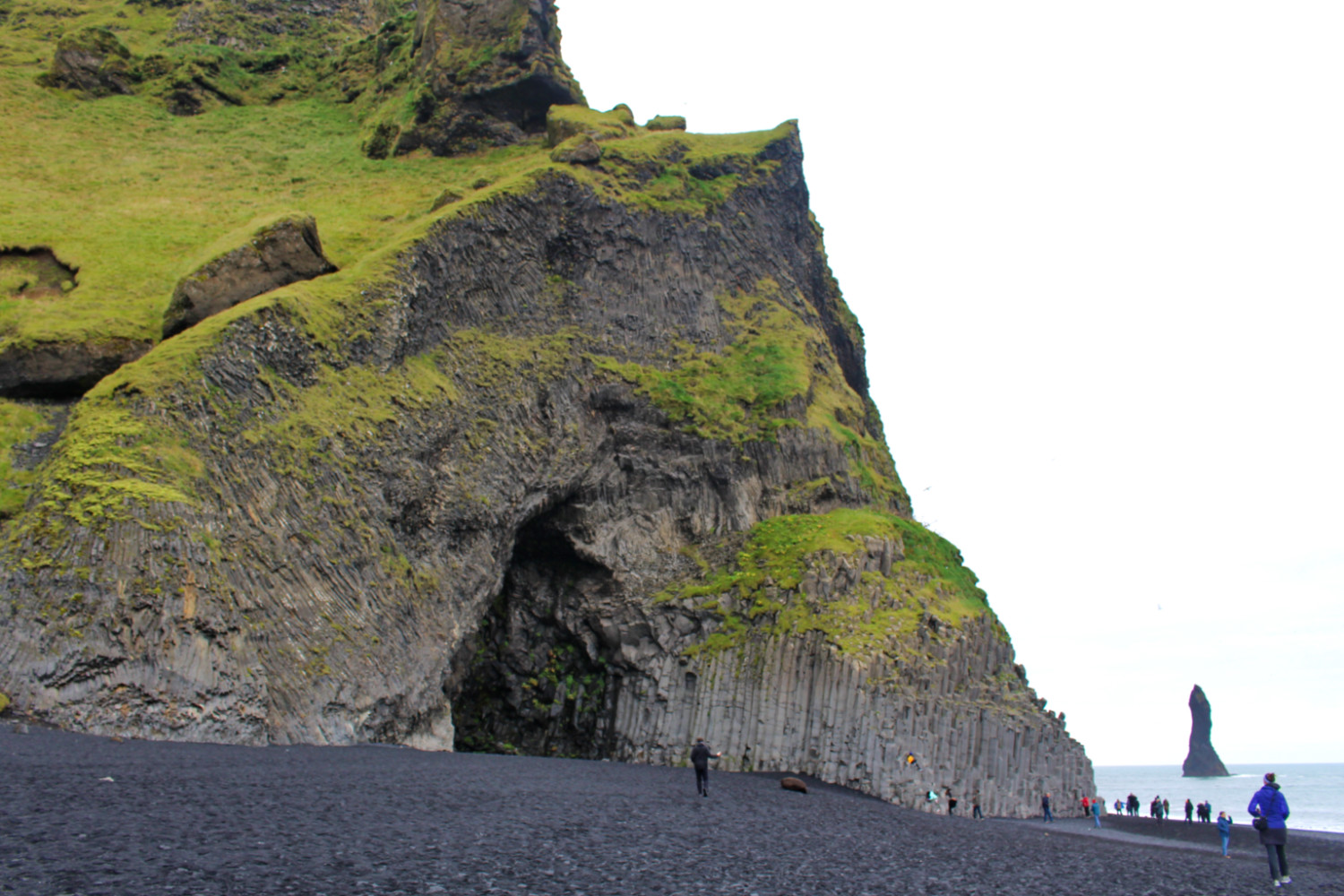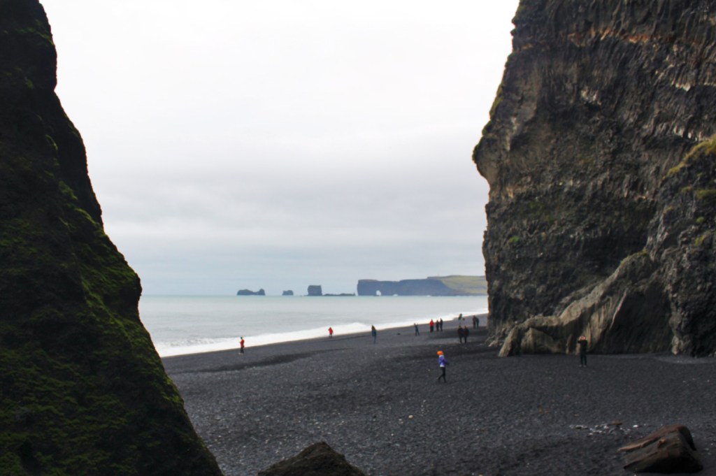 La journée fut moins dense que la veille. Nous avons commencé par aller sur la plage au bout de la petite route de notre auberge, la fameuse plage de Reynisfjara, utilisée maintes fois dans les films, séries ou clips vidéos. Il y a deux jours, nous étions sur la plage juste de l’autre côté des rochers, sous le soleil, et ce matin, c’était un paysage en noir et blanc. Je comprends mieux pourquoi c’est ce côté de la plage qui est plus prisé. On trouve ici les falaises en colonnes de basalte. Malgré le météo sinistre, il y avait pas mal de monde sur le plage. Je suis contente de la voir avec ce temps finalement, car la brume ne fait sublimer ce paysage déchiré.