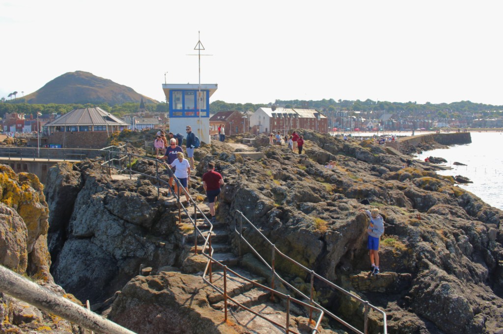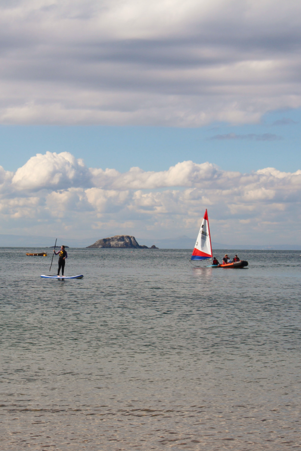 Cette petite station balnéaire familiale ne manque pas de charme avec ses deux plages dominées par la colline de The Law. Après dix minutes de marche depuis la gare, j’ai atteint la plage de West Bay. En ce dernier week-end d’août, elle était animée avec quelques touristes, mais surtout avec beaucoup de locaux venus assister à la régate annuelle des clubs de rameurs du coin. Je n’étais pas équipée pour me baigner, mais j’admirais les vacanciers qui tentaient le coup, avec ou sans combinaison. Que ce soit en bateau, en paddle, ou à la nage, les gens profitaient de la mer et du soleil rayonnant sur la plage de West Bay.