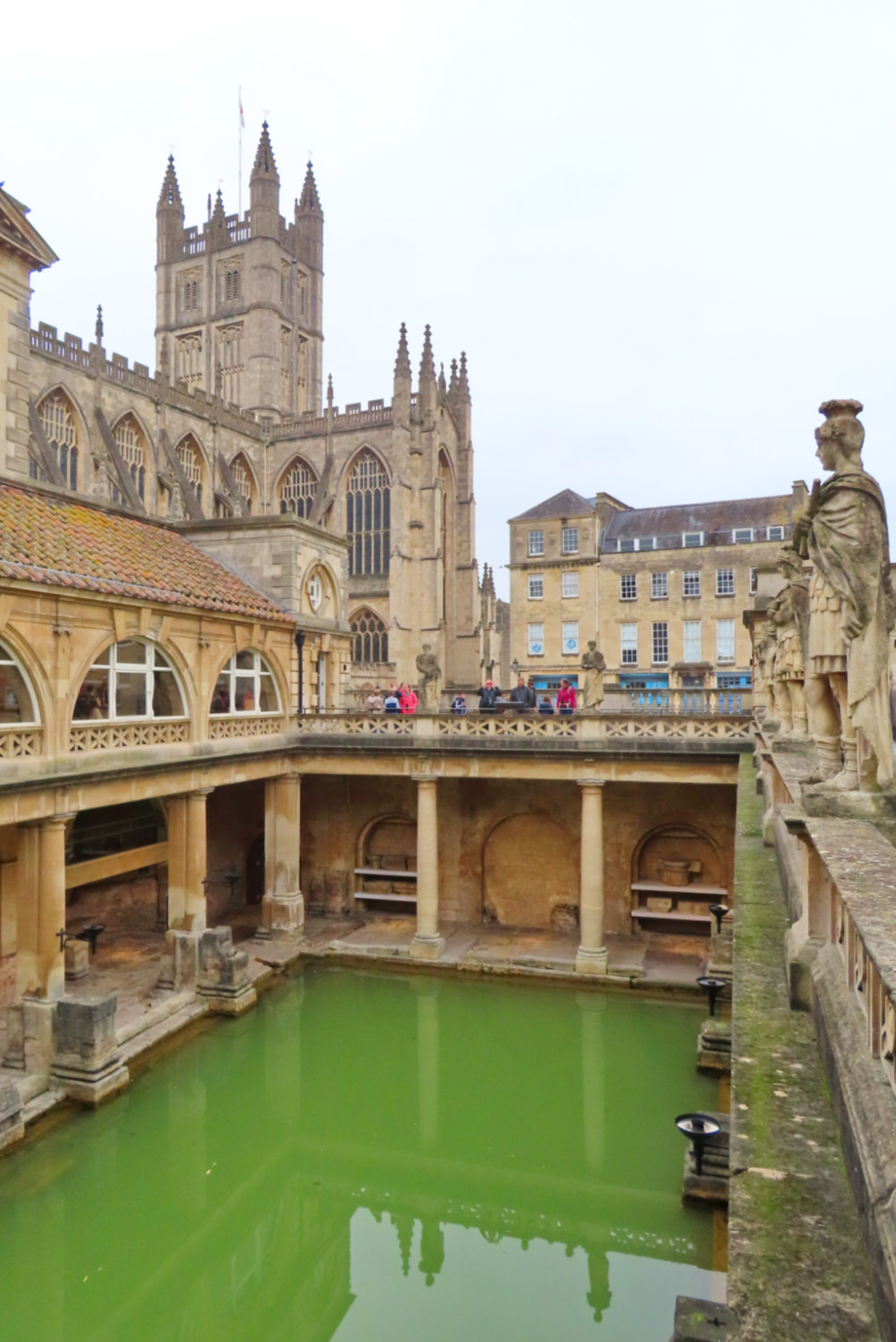La visite vous mène sur les terrasses victoriennes surplombant le Grand bassin avec ses statues, aux vestiges romains du Temple de Minerve, mais aussi des vestiaires et salles de sauna romain. Il est désormais interdit de se baigner dans les bassins, les eaux sont verdâtres et fumantes (46°C). Encore aujourd’hui, plus d’un million de litres jaillissent de la source chaque jour. Le point d’orgue de la visite est sûrement le Grand bassin, entouré par ses colonnes. Au temps des Romains, il était couvert par une voute de 20 m de haut (ce qui préservait l’eau de la lumière et donc de la prolifération des algues qui lui donnent désormais sa couleur verte). C’est sûrement la vue la plus iconique de Bath, avec l’abbaye en arrière-plan.