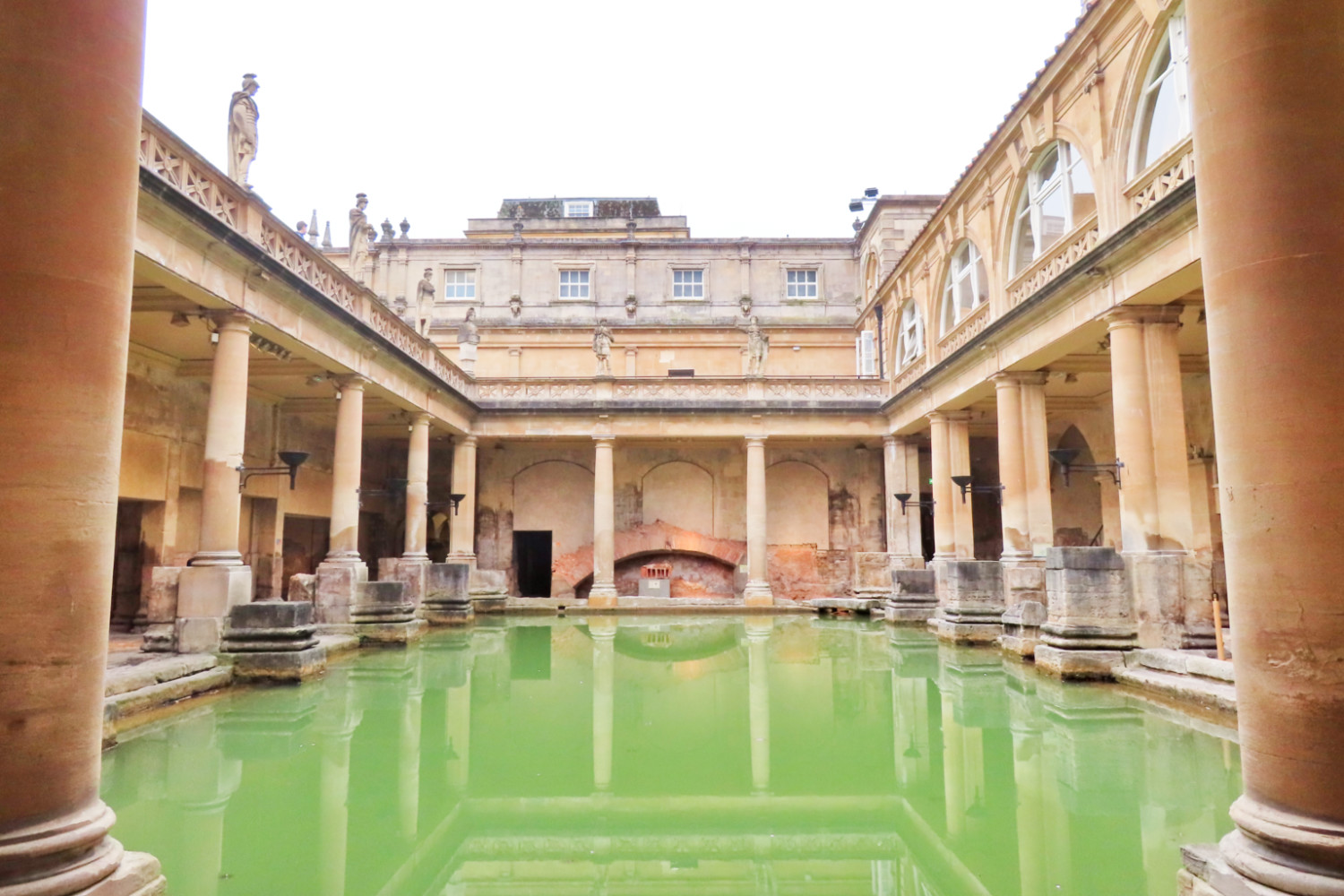 Les thermes romains, dédiés à la déesse Sulis Minerve, sont composés de plusieurs bassins alimentés par la source sacrée. Les Romains venaient se relaxer, profiter des bienfaits des eaux, mais aussi prier. Ainsi, les Romains jetaient des offrandes dans le bassin de la source sacrée dont des bijoux et 12 000 pièces de monnaie. La couleur orange provient du taux de fer.