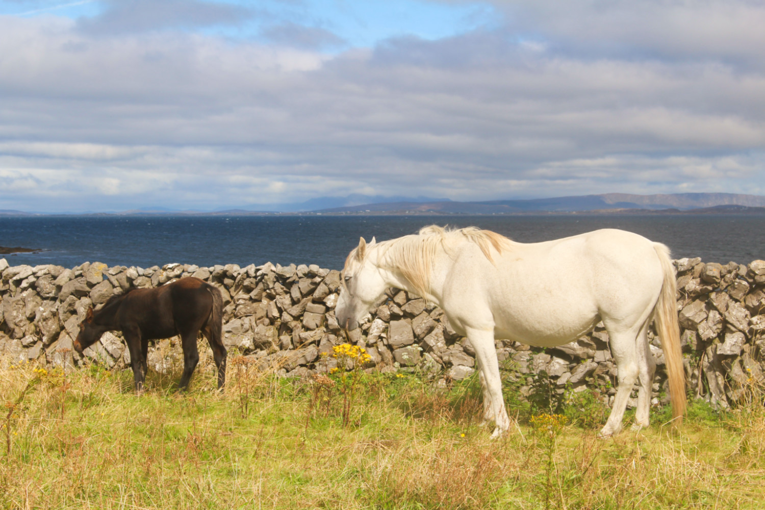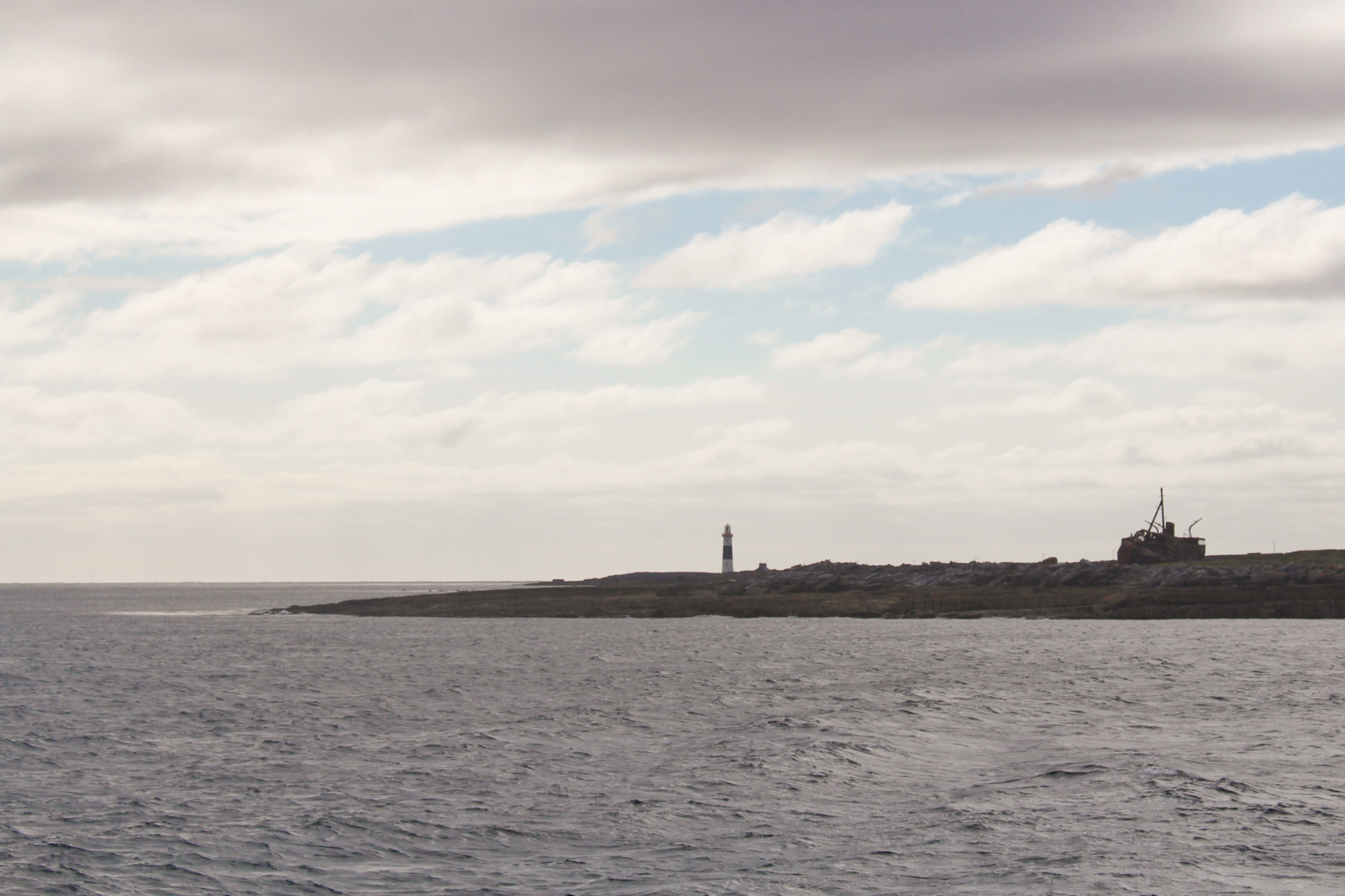 Dès que le bateau a quitté Kilronan, le ciel s’est de nouveau assombri. La traversée du retour est plus longue (2h30), car le ferry longe les deux autres îles de l’archipel: Inis Meáin (ce qui signifie « l’île du milieu ») et Inis Oírr, la plus petite (« l’île de l’est »). L’occasion d’apercevoir l’épave du Plassey, échouée sur les cailloux depuis 1960.