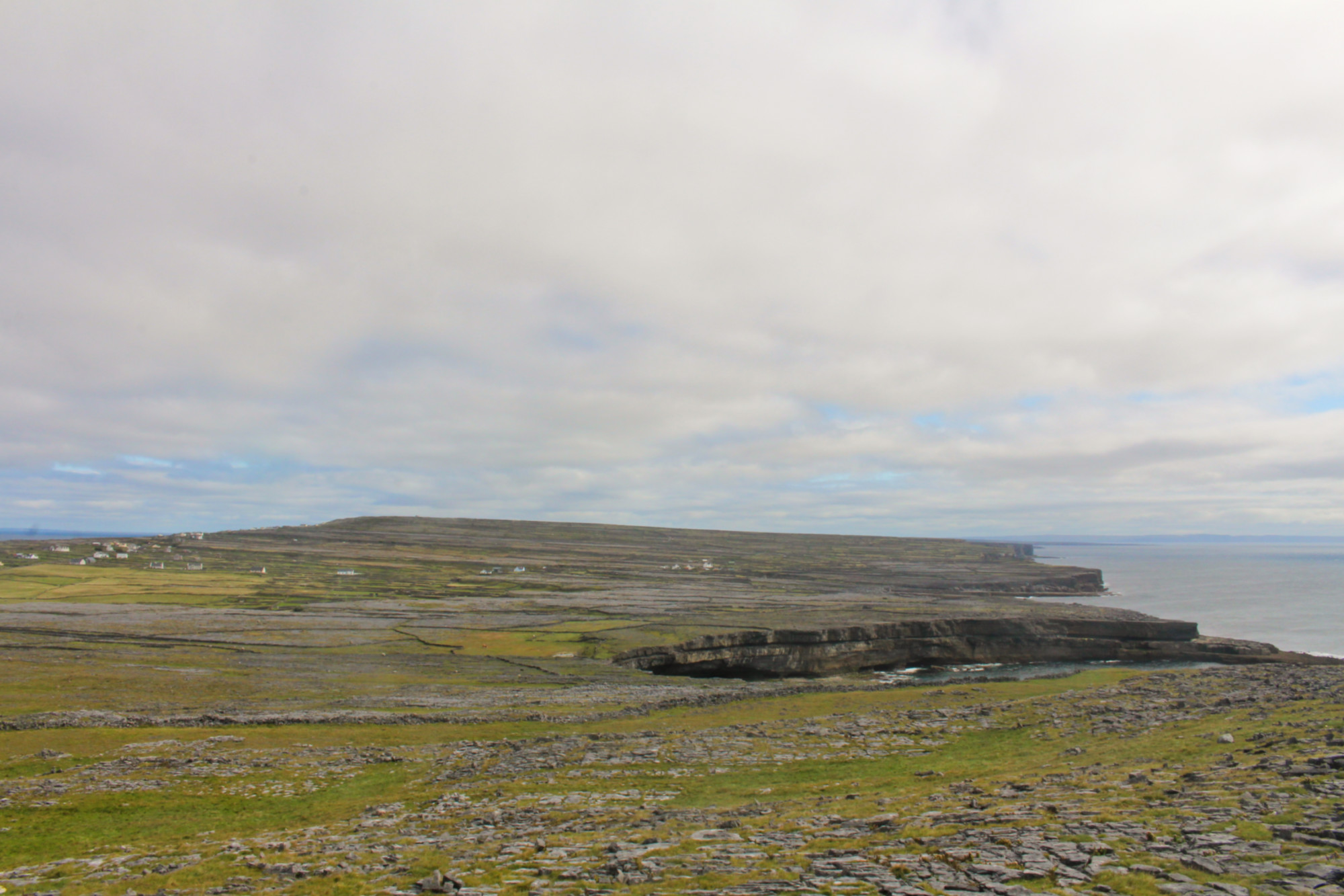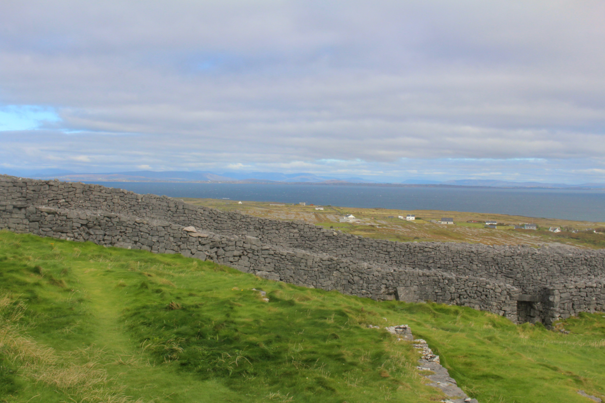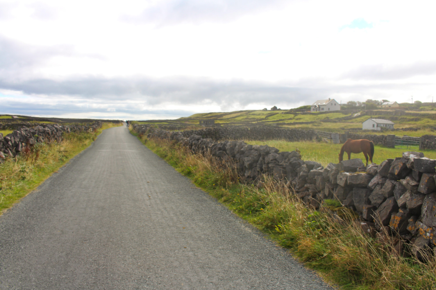 De plus, les voitures y sont proscrites (sauf celles des 800 riverains et les vans pour promener les touristes). C’est donc une île très paisible. On peut y circuler en cariole à chevaux (qu’on trouve dès la sortie du bateau) ou à vélo (loueurs situés sur le port). J’ai choisi cette dernière option. L’île ne fait que 14 km de long, et est plutôt plate, on peut donc l’arpenter facilement. Elle est parsemée de murets en pierres sèches parcellant le territoire de milliers de petits champs pour les vaches et les chevaux. En effet, les îles d’Aran sont composées de karst, roche typique de la région irlandaise du Burren située juste en face de l’archipel. Rien ne pousse sur ces terres austères.