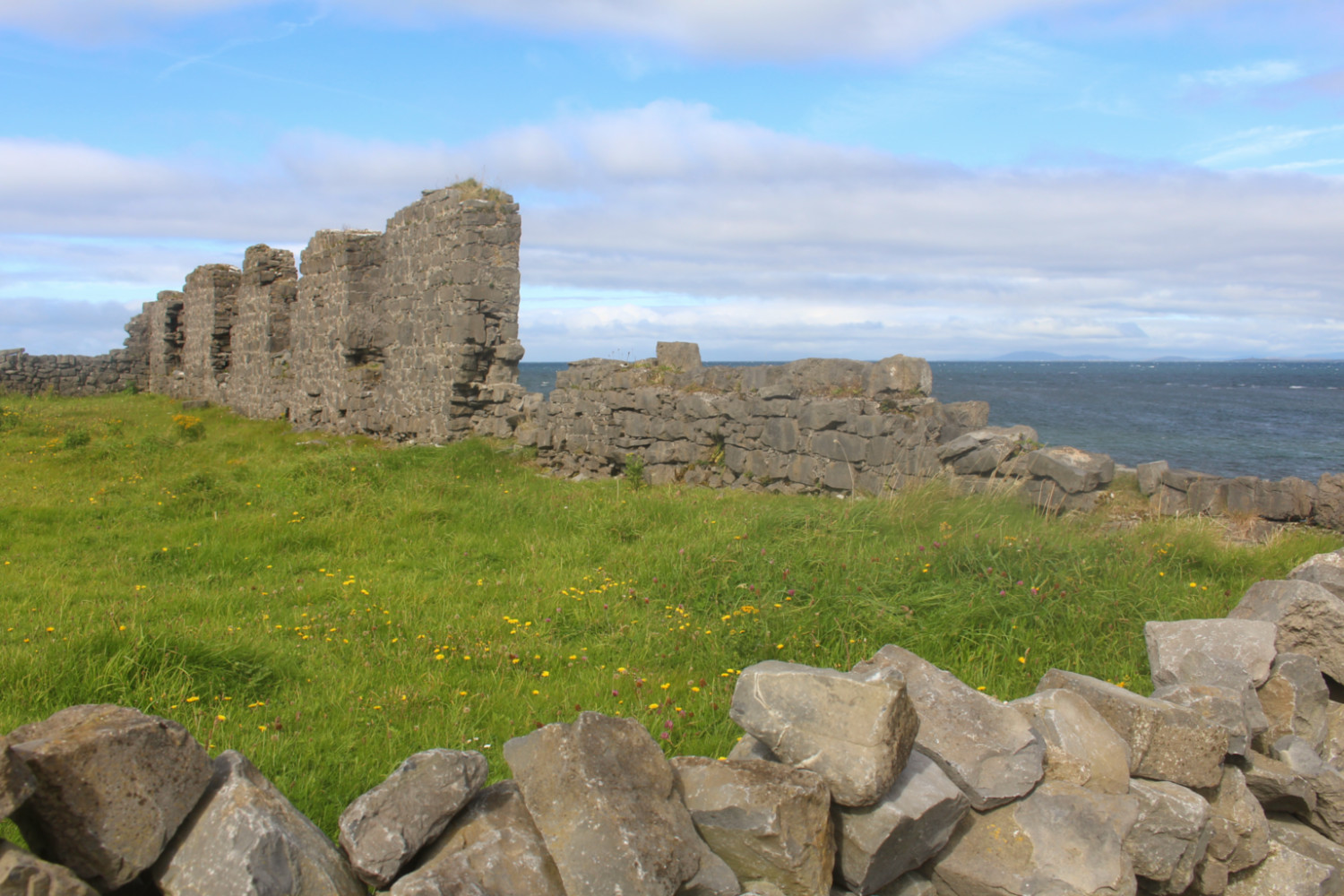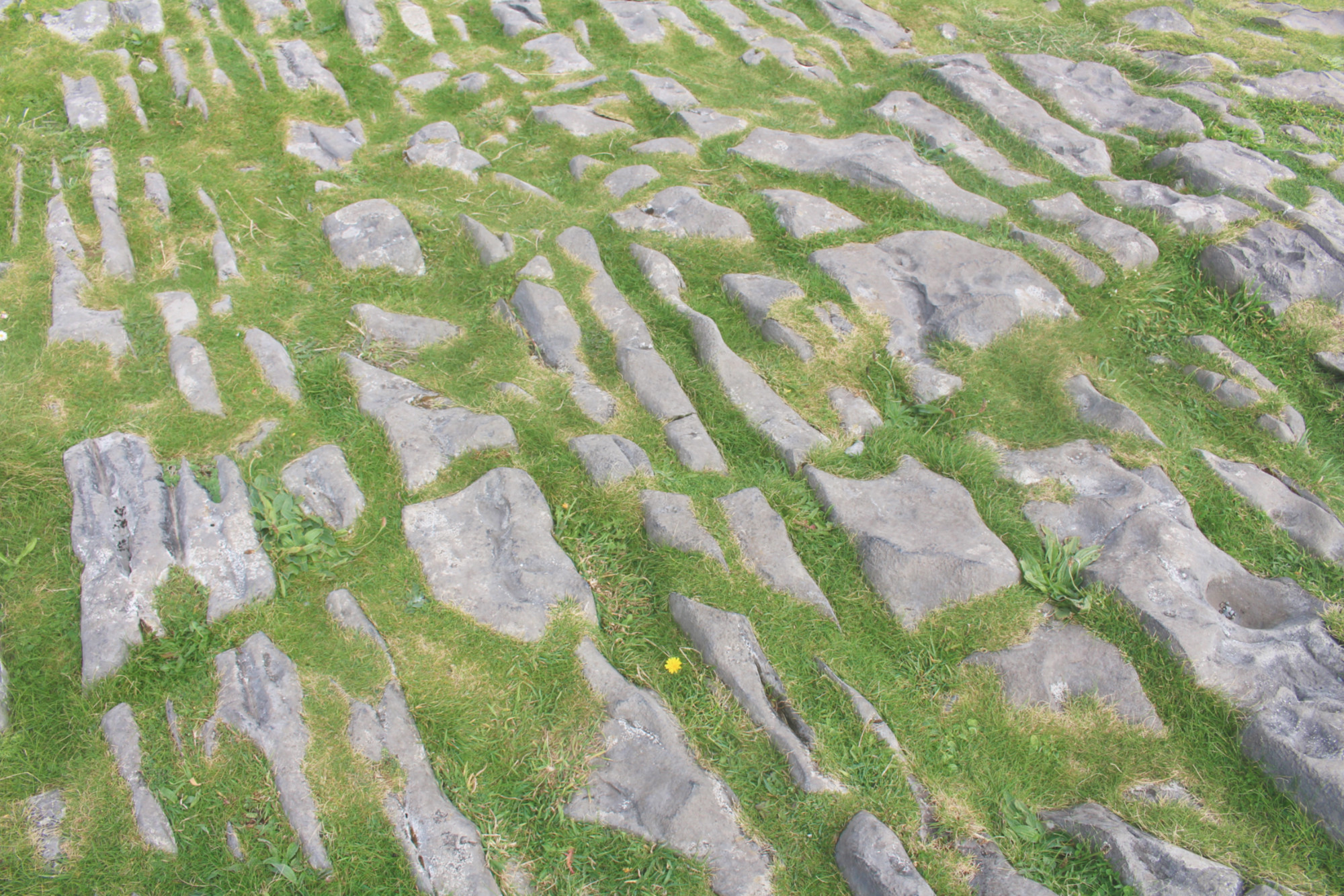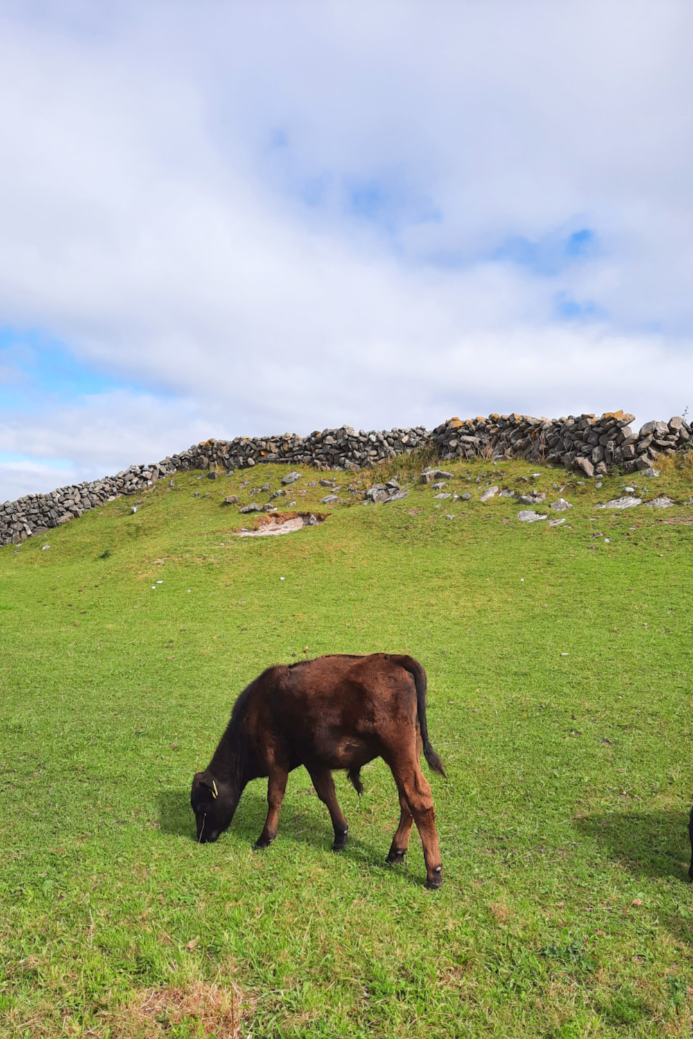 De plus, les voitures y sont proscrites (sauf celles des 800 riverains et les vans pour promener les touristes). C’est donc une île très paisible. On peut y circuler en cariole à chevaux (qu’on trouve dès la sortie du bateau) ou à vélo (loueurs situés sur le port). J’ai choisi cette dernière option. L’île ne fait que 14 km de long, et est plutôt plate, on peut donc l’arpenter facilement. Elle est parsemée de murets en pierres sèches parcellant le territoire de milliers de petits champs pour les vaches et les chevaux. En effet, les îles d’Aran sont composées de karst, roche typique de la région irlandaise du Burren située juste en face de l’archipel. Rien ne pousse sur ces terres austères.