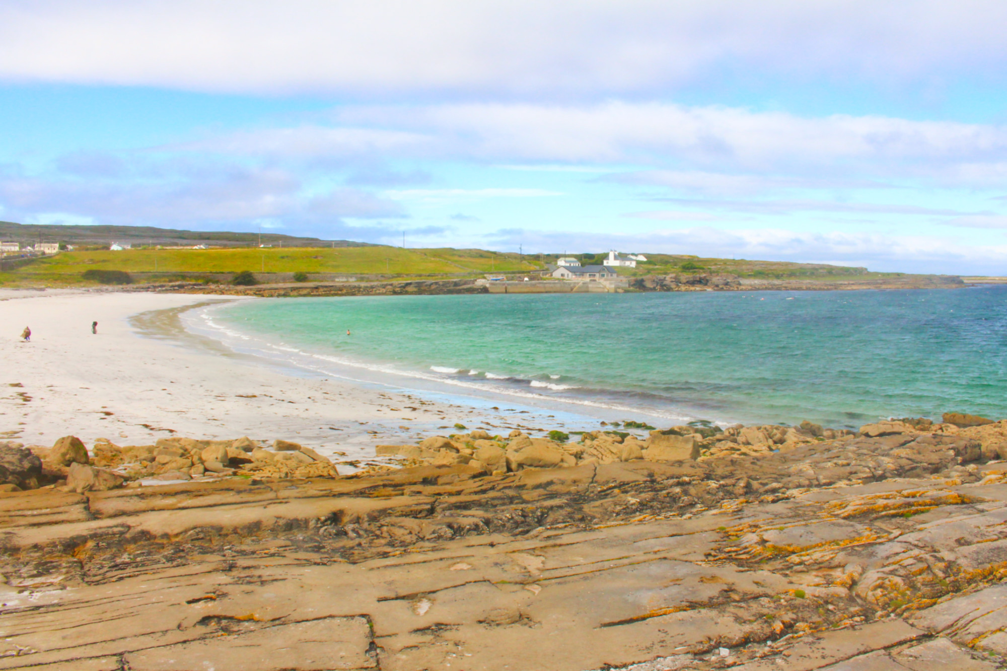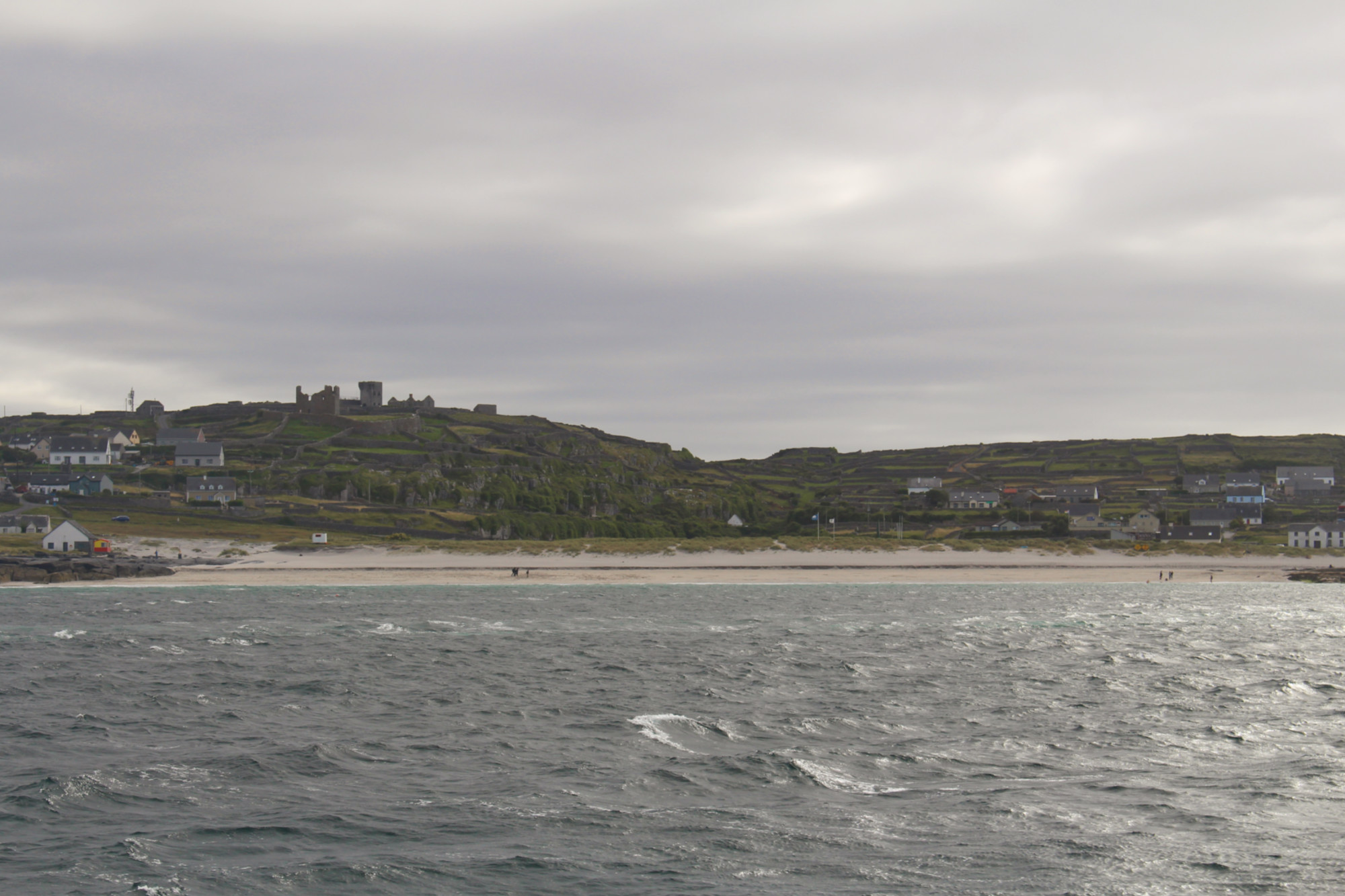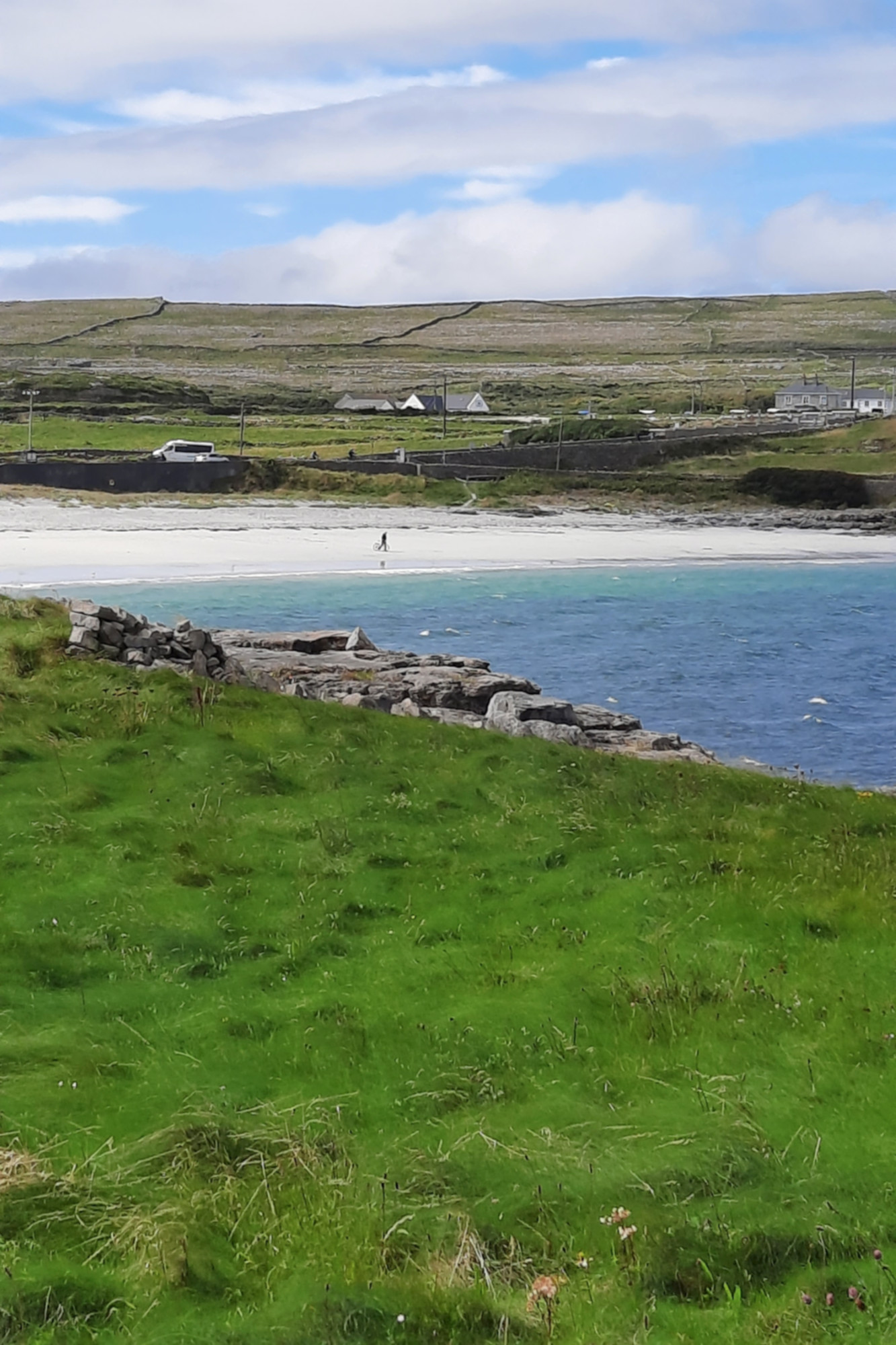 Le vent soufflait en rafale, il faut dire qu’il n’y a rien sur l’île pour l’arrêter. J’ai donc roulé contre le vent jusqu’à la plage de Kilmurvey et ses eaux turquoises. J’ai même croisé des personnes assez courageuses pour se baigner malgré la tempête de sable. En apercevant la plage au loin, je m’étais dit que cela serait le spot parfait pour pique-niquer, mais les bourrasques faisaient tournoyer le sable et j’ai dû me réfugier derrière un muret pour manger à l’abri.