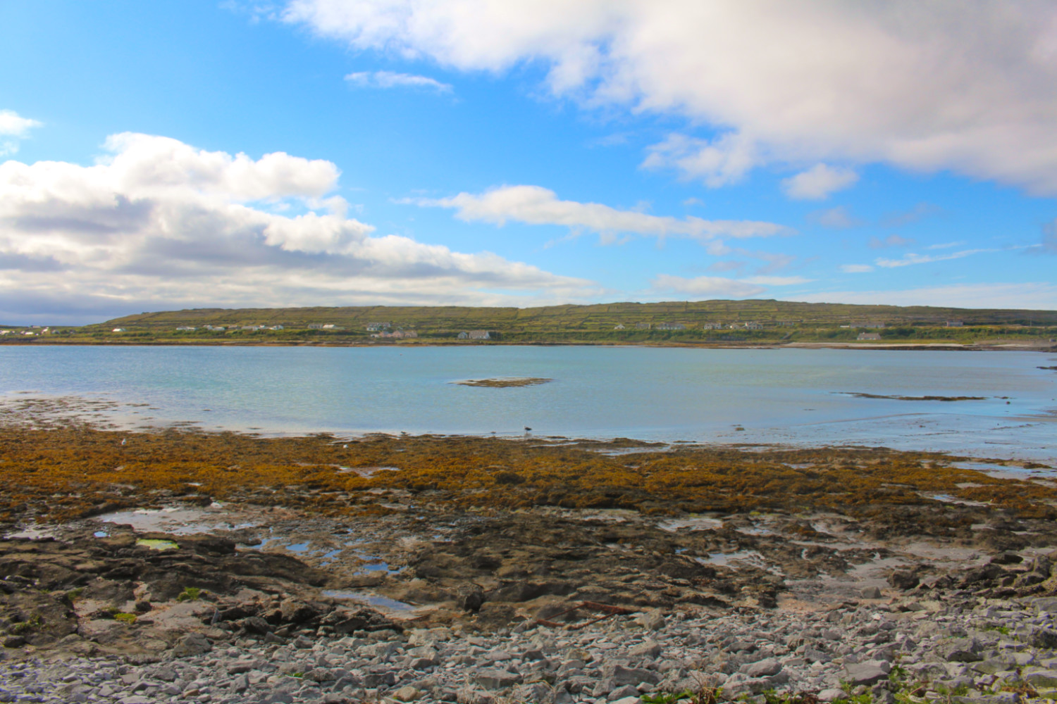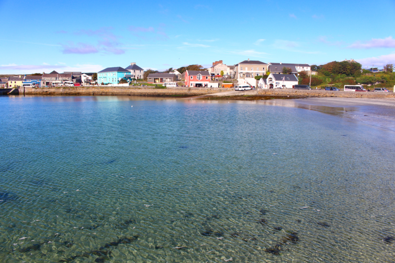 Il faut une heure et demie de traversée depuis le port de Galway jusqu’à Inis Mór. La journée ne commençait pourtant pas sous les meilleurs auspices puisque j’ai pris le bateau sous la pluie, le vent et le froid. Et comme par miracle, cinq minutes avant notre arrivée, j’ai vu le soleil percer les nuages au-dessus des îles. C’est donc avec un beau ciel bleu que j’accoste au port de Kilronan et que je découvre ses eaux cristallines.