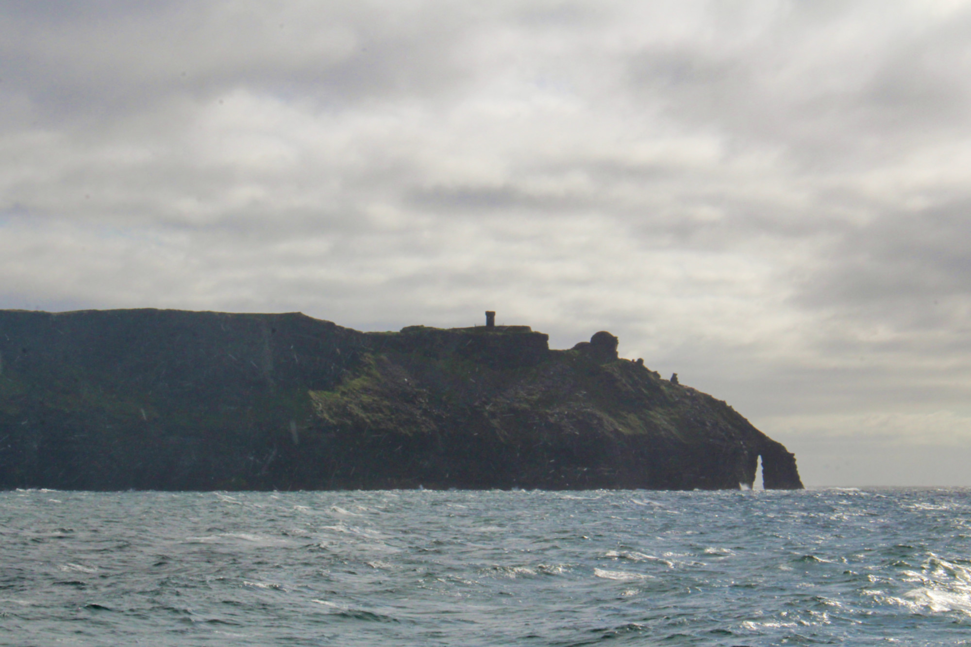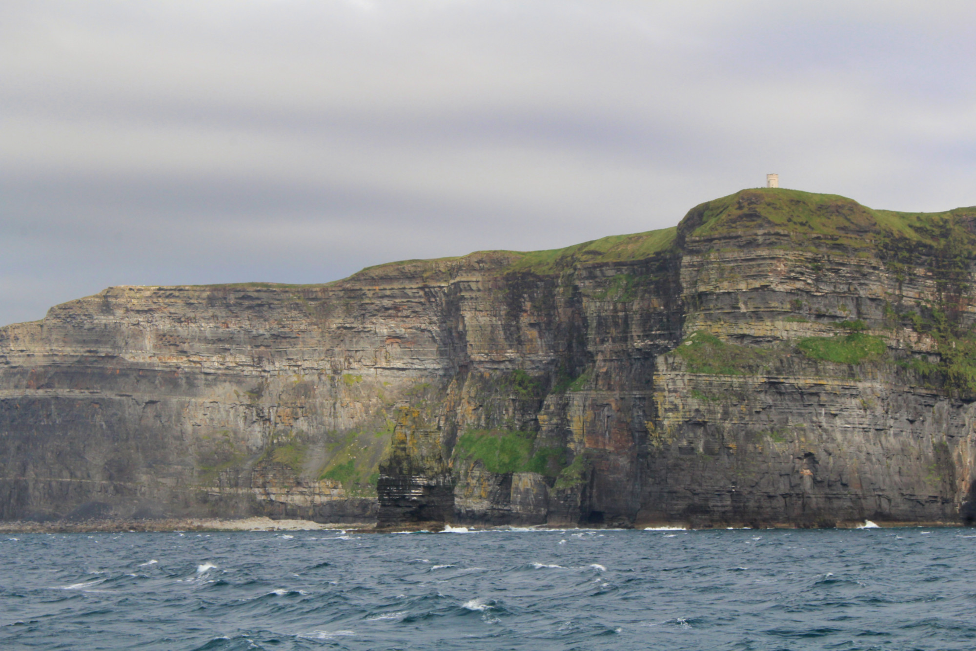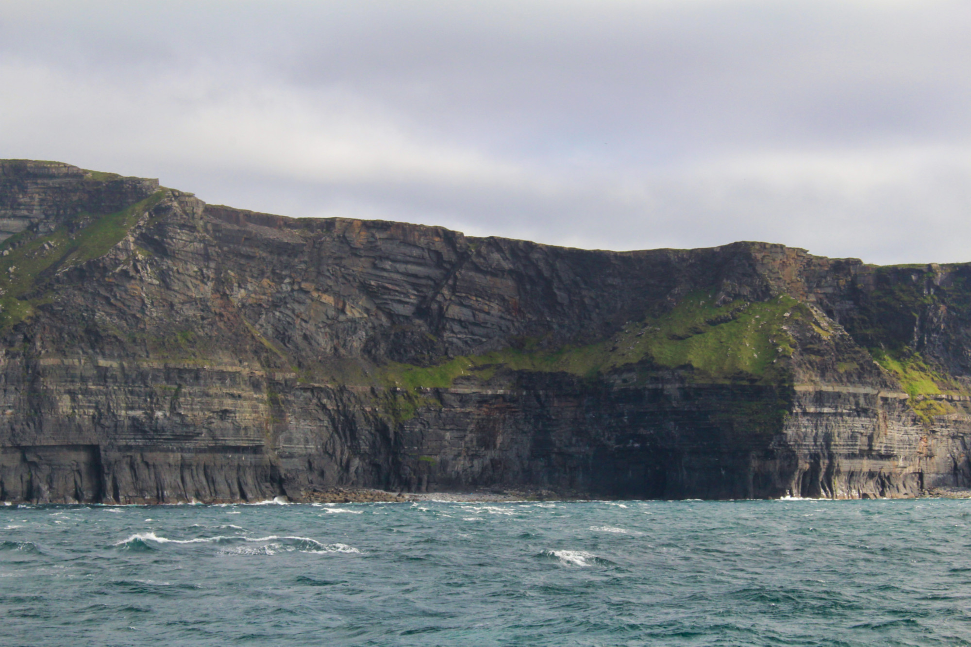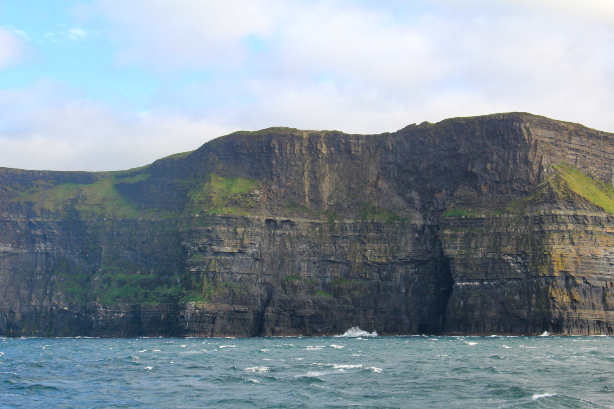 Le ferry remonte ensuite le long de la côte du Burren pour s’approcher des fameuses falaises de Moher. Je les avais vues de la terre il y a quelques années, mais elles sont peut-être encore plus impressionnantes vues de la mer. Il faut dire que la houle à ce moment-là était assez forte, si bien que nous les apercevions seulement quand le bateau penchait à gauche (estomacs sensibles, s’abstenir!). Tout le monde se précipite à gauche du pont du bateau dès que les falaises sont en vue, mais je conseille de patienter et de rester à droite puisque le ferry les longe ensuite de ce côté (tout le monde se bat pour la vue!). On peut apercevoir la grotte qui figure dans Harry Potter (le Prince de Sang mêlé).