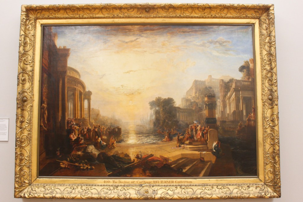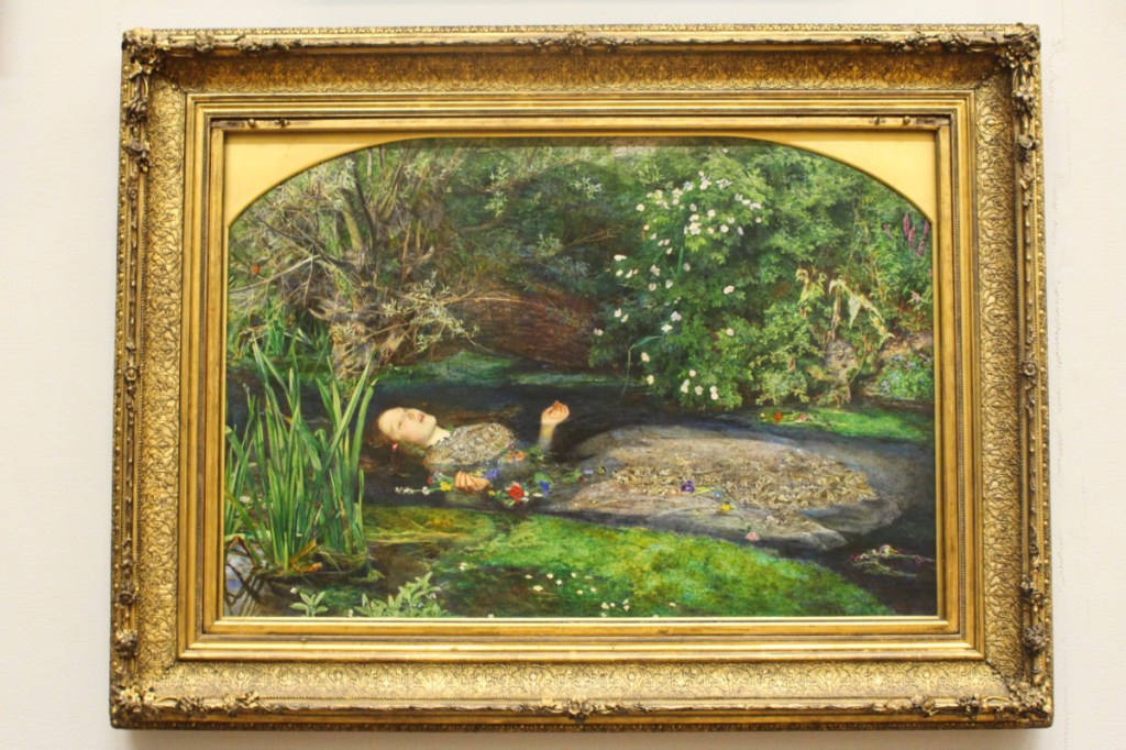 La Tate Britain fait partie du réseau des musées Tate en Grande-Bretagne. Il en existe 4: Tate Liverpool (1988), Tate St Ives (Cornouailles, 1993) et Tate Modern (Londres, 2000). Située au bord de la Tamise, elle est d’ailleurs reliée à la Tate Modern par un bateau. La Tate Britain est la plus vieille des 4 car ouverte depuis 1897, elle portait alors le nom de National Gallery of British Art. Si son nom a évolué (de Tate Gallery en 1932 à Tate Britain depuis 2000), son sujet lui est resté le même: la peinture britannique à travers les âges. Le musée (gratuit) est extrêmement bien organisé car il suffit de suivre les galeries dans l’ordre pour voyager chronologiquement à travers les différents tableaux. L’exploration commence donc par une première salle en 1540 pour s’achever à des artistes des années 2000 dans la dernière salle. La collection du musée est remarquable…même si au final je me suis rendue compte que je connaissais peu de peintres britanniques en dehors des très connus (Francis Bacon, John Constable…). J’ai passé beaucoup de temps à regarder les détails de l’Ophelia de John Everett Millais. Et j’étais surprise après tous ces beaux tableaux classiques de finir ma visite avec A bigger splash de David Hockney. Mais je crois que le gros point fort de la Tate Britain, c’est sa collection de tableaux de Joseph Turner (1775-1851). Plusieurs salles lui sont consacrées pour abriter les 282 toiles et aquarelles du maître anglais. Son utilisation et sa maîtrise la lumière valent à elles-seules une visite à la Tate Britain. Turner a tellement marqué l’art britannique qu’il existe un prix Turner très médiatisé que l’on décerne tous les ans aux jeunes artistes les plus prometteurs.