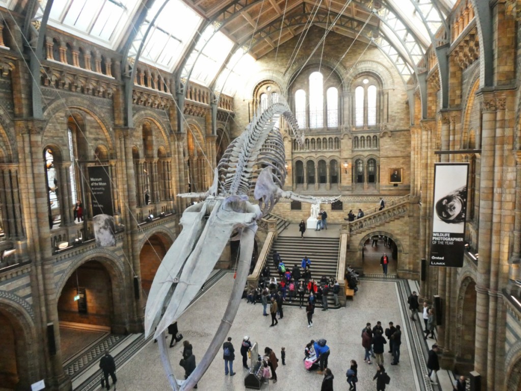Le musée d’Histoire naturelle de Londres est tout simplement impressionnant, rien que le bâtiment est sublime avec son faux-air d’école d’Harry Potter. Il est également immense, il faut prévoir plusieurs heures pour le visiter. S’il y a trop de monde à l’entrée principale, il y a une entrée secondaire dans Exhibition Road. Le Natural History Museum a été inauguré en 1881. Ce musée familial présente des collections remarquables sur les créatures peuplant la Terre, vivantes ou disparues, ainsi que sur l’histoire et la composition de notre planète et du système solaire. Dans le hall d’entrée se trouve Hope, un gigantesque squelette de baleine bleue de 25 mètres de long (de 1905 à 2017 c’était le squelette d’un diplodocus qui accueillait les visiteurs). Il est divisé en zones de couleur selon le sujet, ce qui est très pratique. En zone bleu, tout ce qui touche aux dinosaures (et il y en a beaucoup!), au corps humain, aux mammifères etc…En zone rouge, tout ce qui touche à la composition de la Terre, en zone verte vous trouverez tout ce qui touche aux animaux et à l’écologie, et enfin en zone orange ce sont les jardins et les labos. Le musée est très ludique et les enfants l’adorent…et il est bien entendu gratuit.