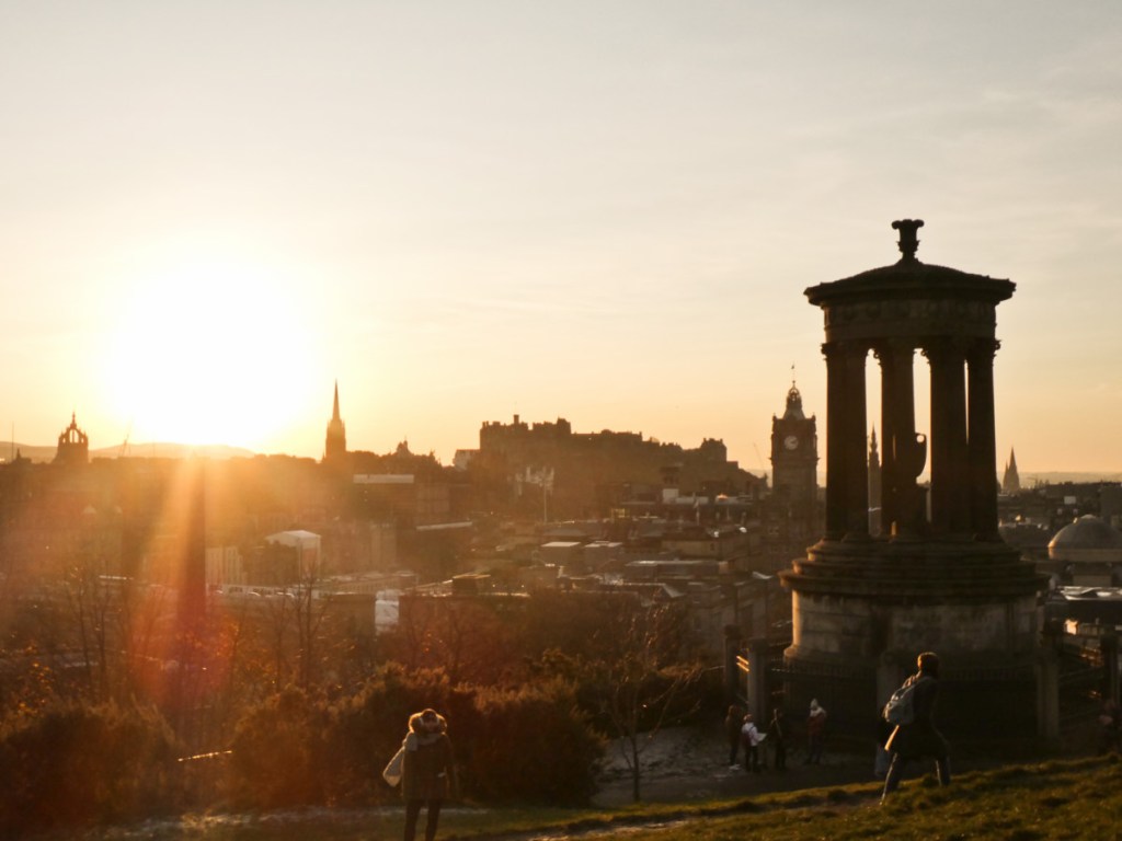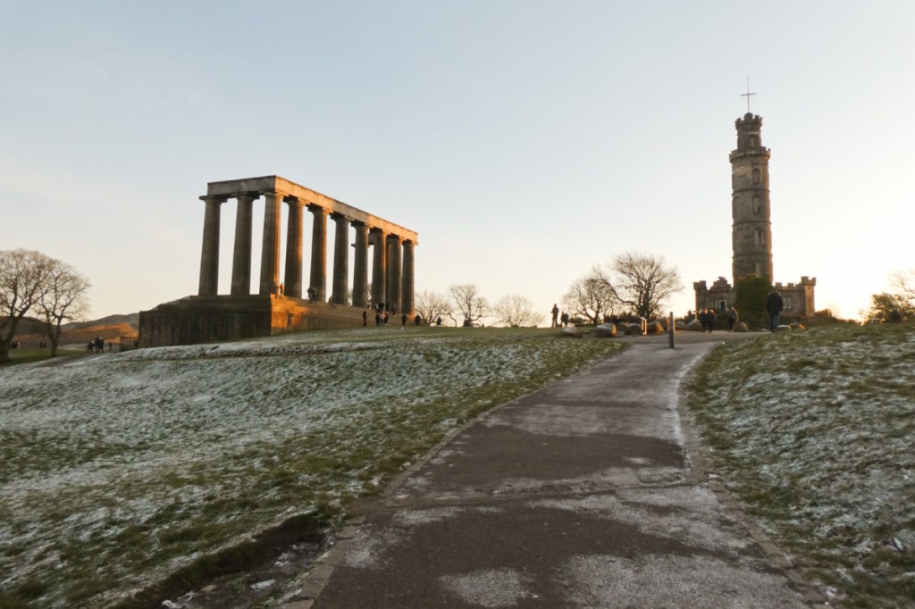 La colline de Calton domine le parlement de l’autre côté. On y voit une sorte de monument antique (le National Monument of Scotland) érigé en 1826 en hommage aux soldats écossais tombés pendant les guerres napoléoniennes, une époque où le classicisme grec était à la mode. Le monument n’a jamais été achevé, faute d’argent. A côté, on peut voir une tour (le Nelson Monument) érigé lui en souvenir de l’amiral Nelson en 1807. Il faut grimper un peu mais la vue sur la ville est incroyable, et encore plus avec le soleil qui se couche derrière le château.