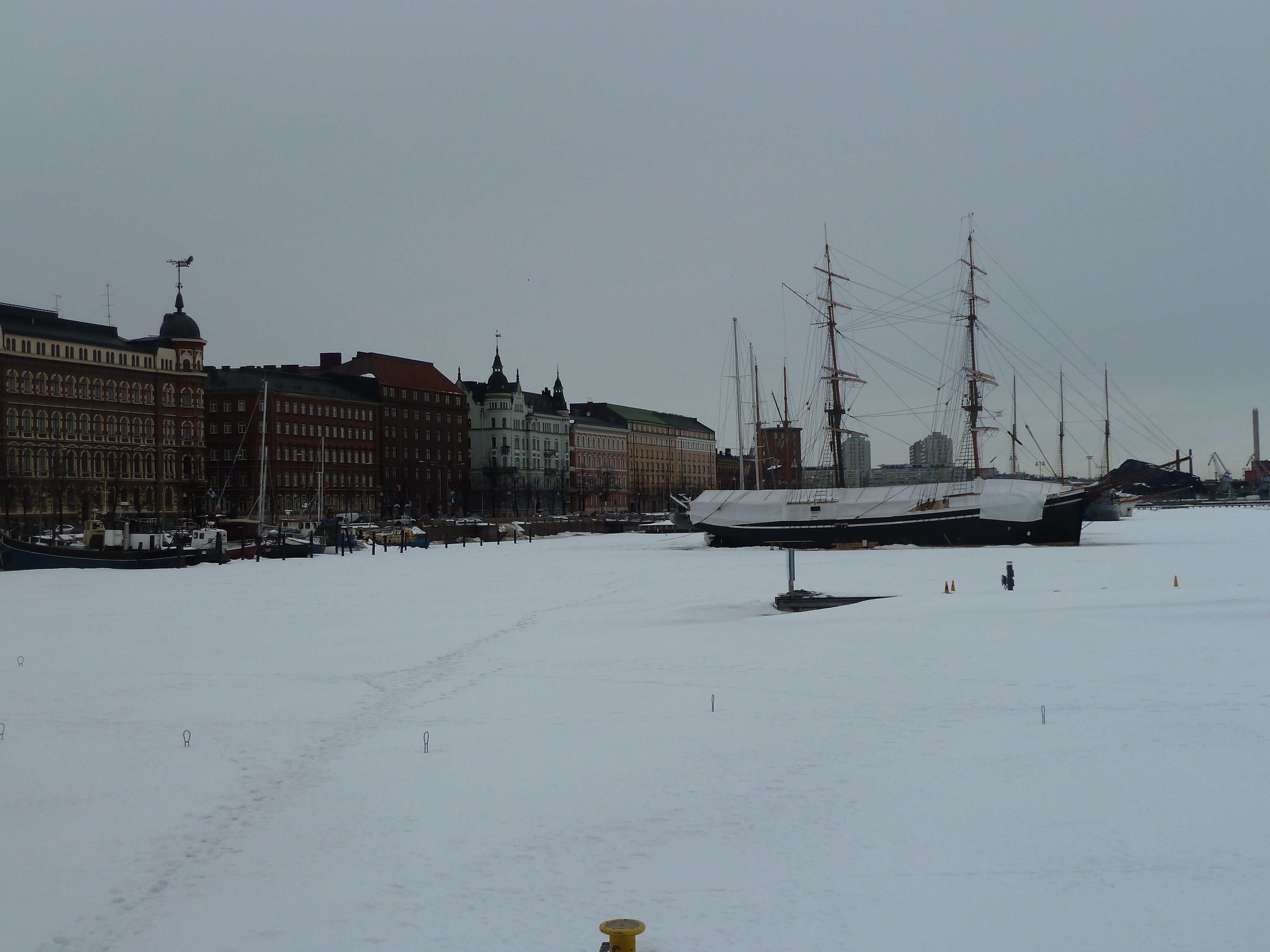 Le port d’Helsinki, complètement gelé en hiver avec ses bateaux figés dans la glace. Les Finlandais y font même du ski de fond.