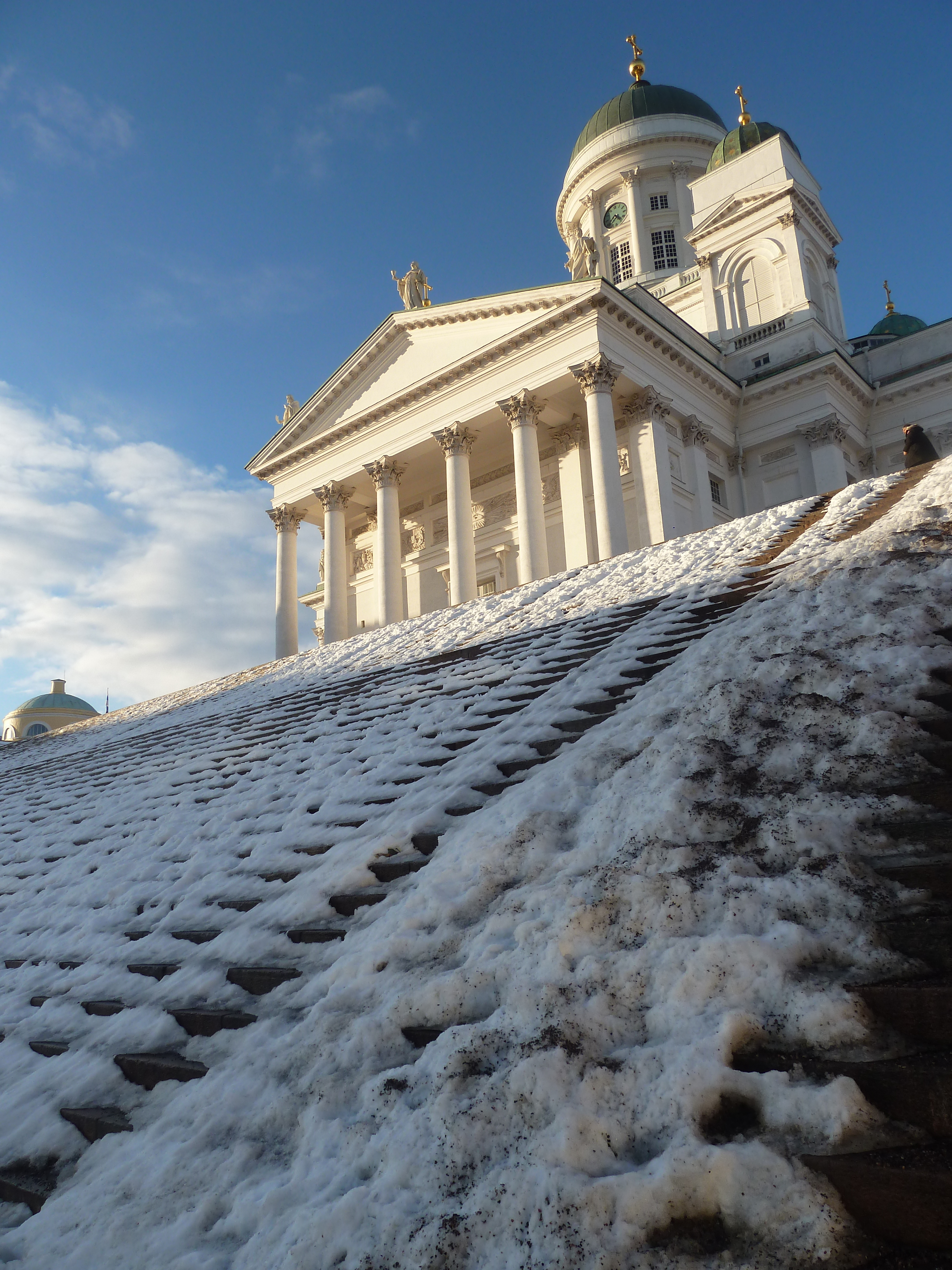 La cathédrale blanche (en finnois Helsingin tuomiokirkko), symbole d’Helsinki, est de confession luthérienne donc assez minimaliste. Elle est située sur la place du Sénat. Construite en 1830, ses petits dômes verts font un clin d’œil aux églises orthodoxes de Russie. Les escaliers qui mènent à l’entrée sont très raides.